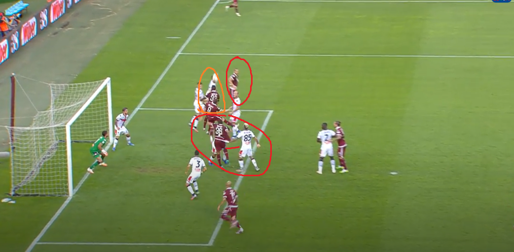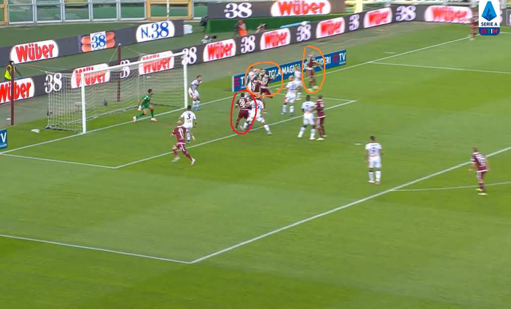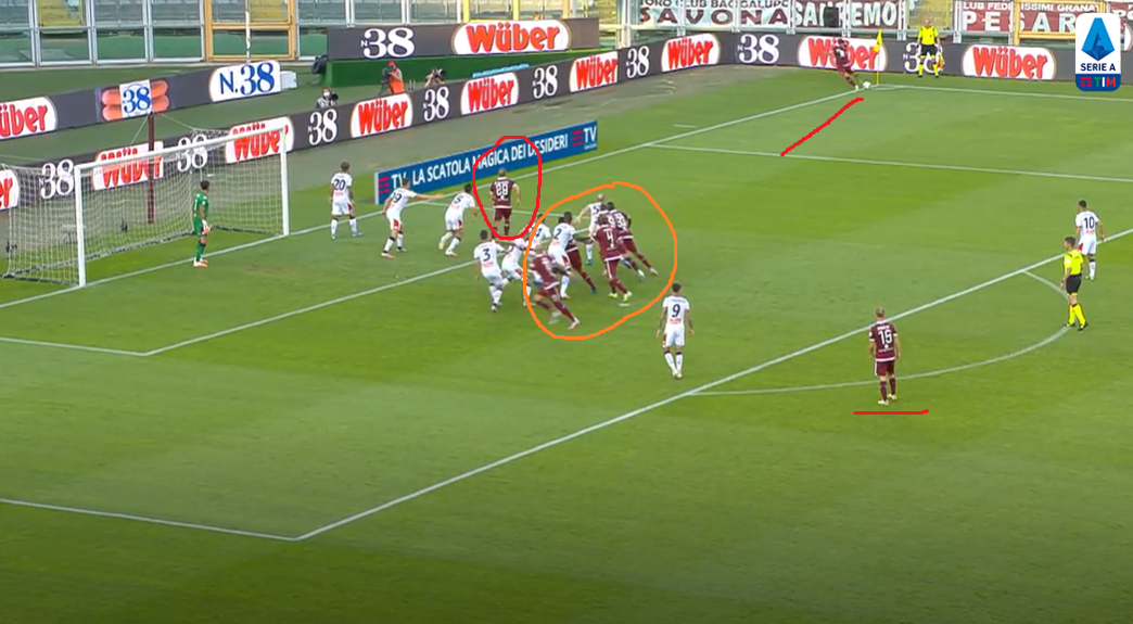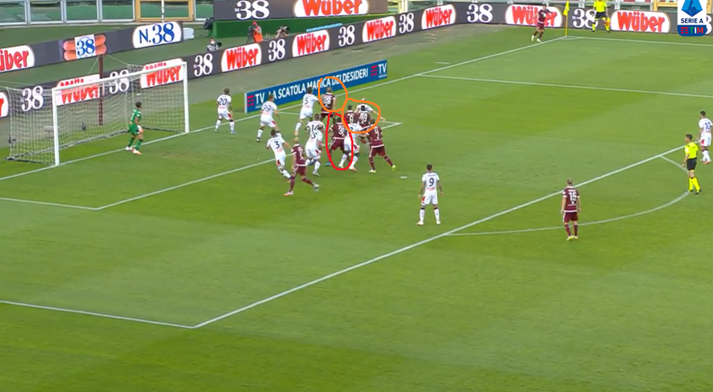 Il movimento dei granata è chiaro fin da subito. Lorenzo De Silvestri si porta sul primo palo per effettuare una possibile torre nel caso in cui il traversone spiova corto. Il laterale, tra l'altro, per ingannare la difesa del Grifone al passaggio della palla al di sopra della propria testa alzerà le mani per rendere ancor più difficile la lettura di chi gli sta alle spalle. Attaccano sempre il primo palo Nicolas Nkoulou (in rete con il Parma sempre sugli sviluppi di palla da fermo) ed Andrea Belotti. Simone Zaza si stacca sul secondo palo, mentre in mezzo al centro della porta si inserisce Gleison Bremer (alle sue spalle a far confusione anche Lyanco).