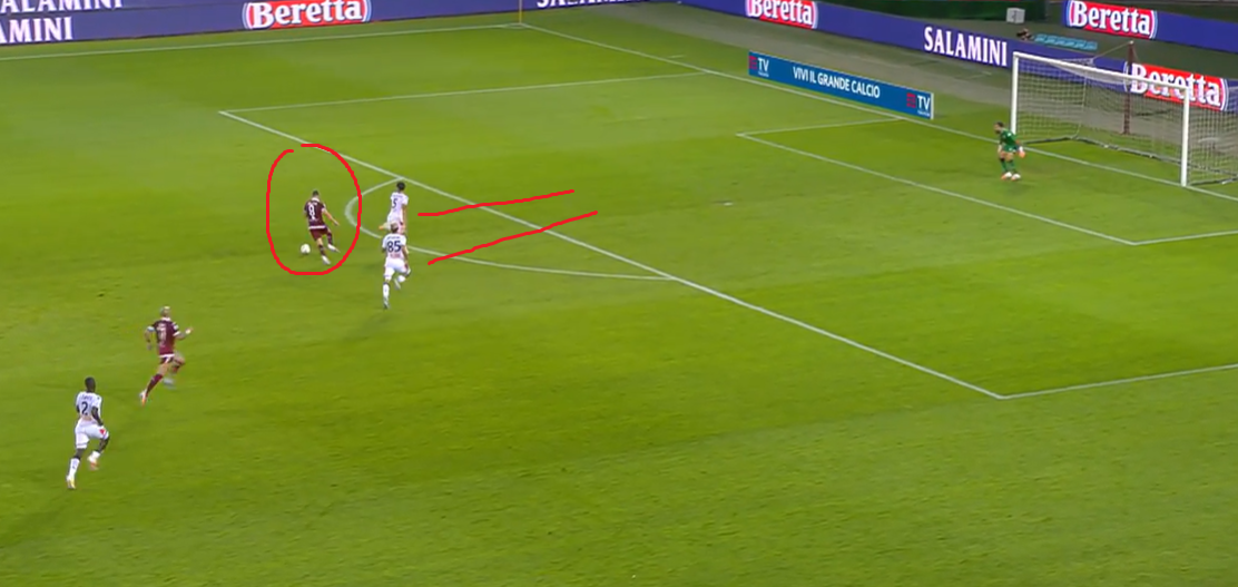 Il resto è un capolavoro del giocatore con il nove sulle spalle e la fascia da capitano al braccio. Belotti recupera la sfera e percorre a campo aperto 30 metri. Ancora una volta prova ad inseguirlo Behrami ma il tentativo di ritorno dell'elvetico è vano. Goldaniga scappa verso la propria porta ma la scelta di temporeggiare non è assolutamente sbagliata. Il difensore del Genoa, infatti, vuole lasciare il male minore a Belotti, ovvero un tiro dai 20/22 metri con il sinistro dopo appunto 30 metri di corsa al 90'.