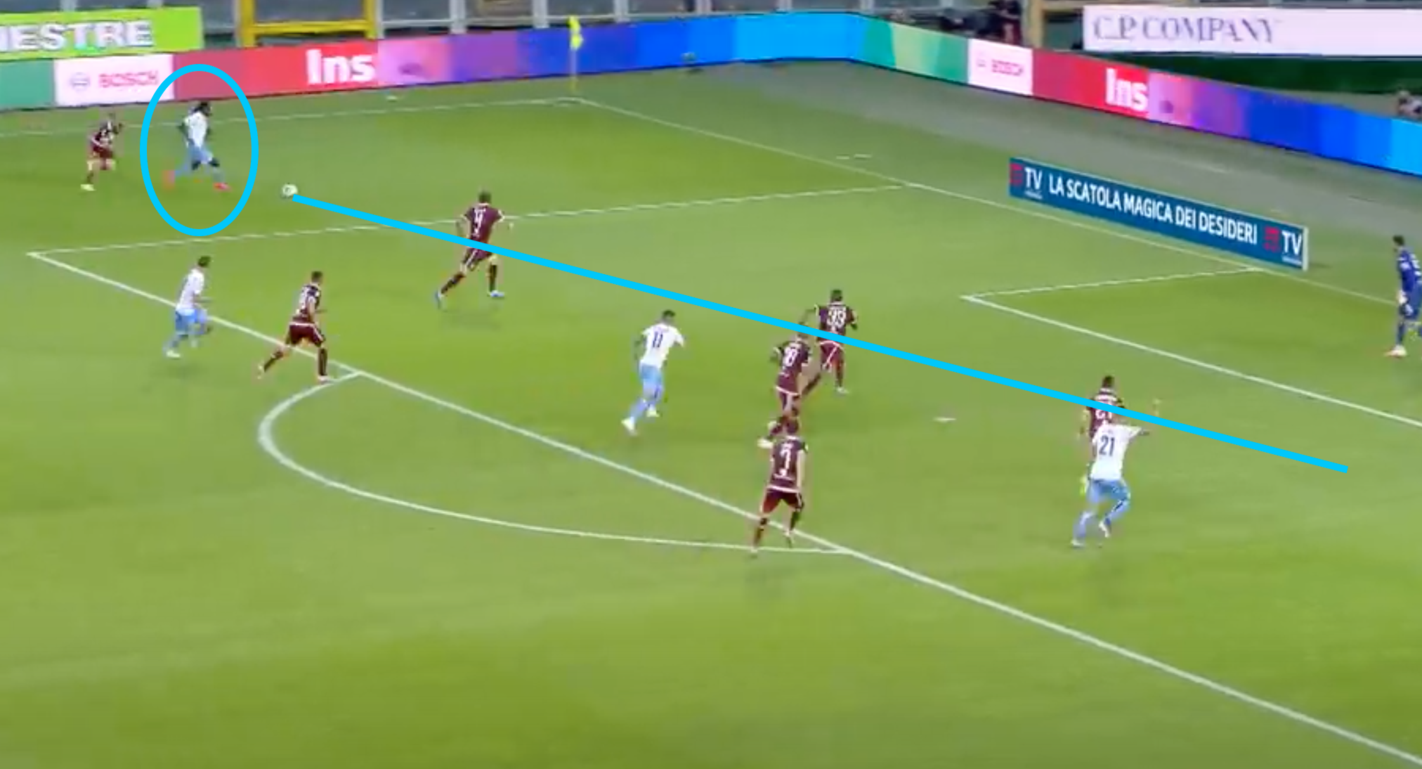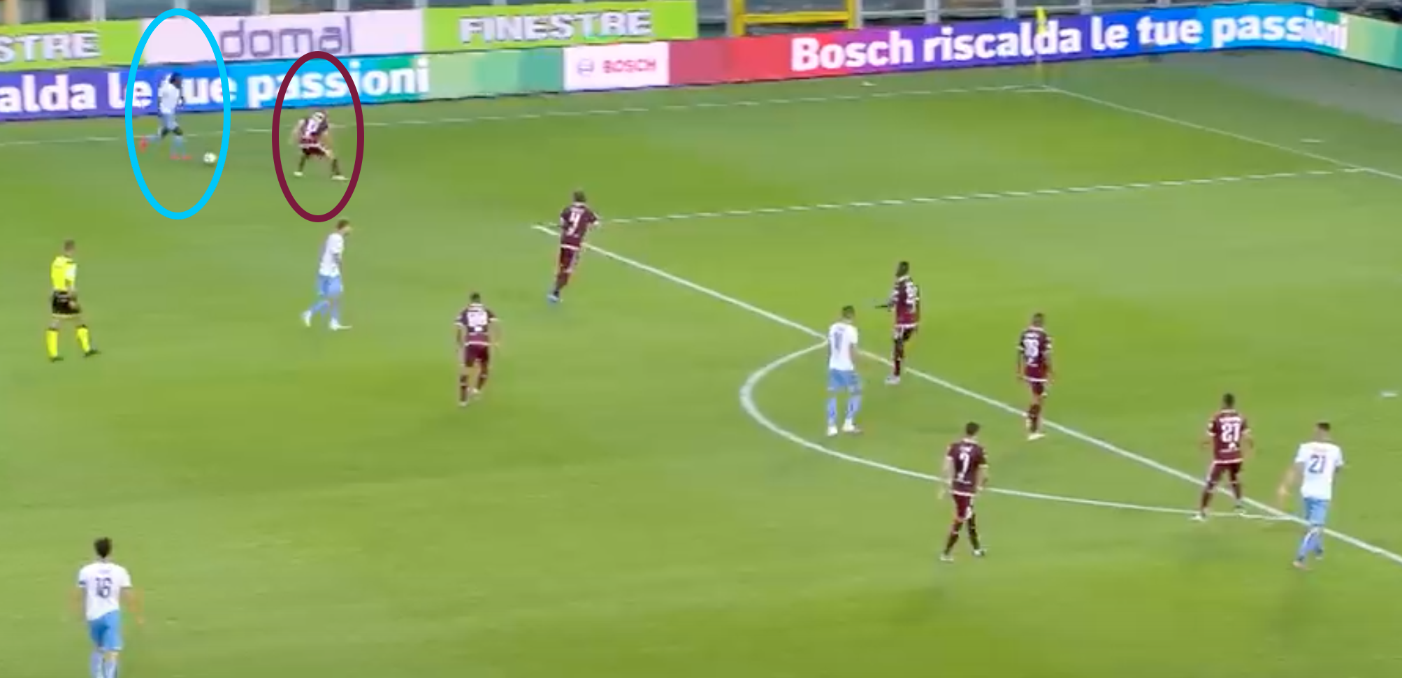 Entrambi i giocatori sono freschissimi, ma Ansaldi si lascia saltare troppo facilmente dal belga. Lukaku deve solo spostare la palla e correre sul fondo per mettere sul secondo palo dove si stava inserendo Milinkovic Savic alle spalle di Berenguer.