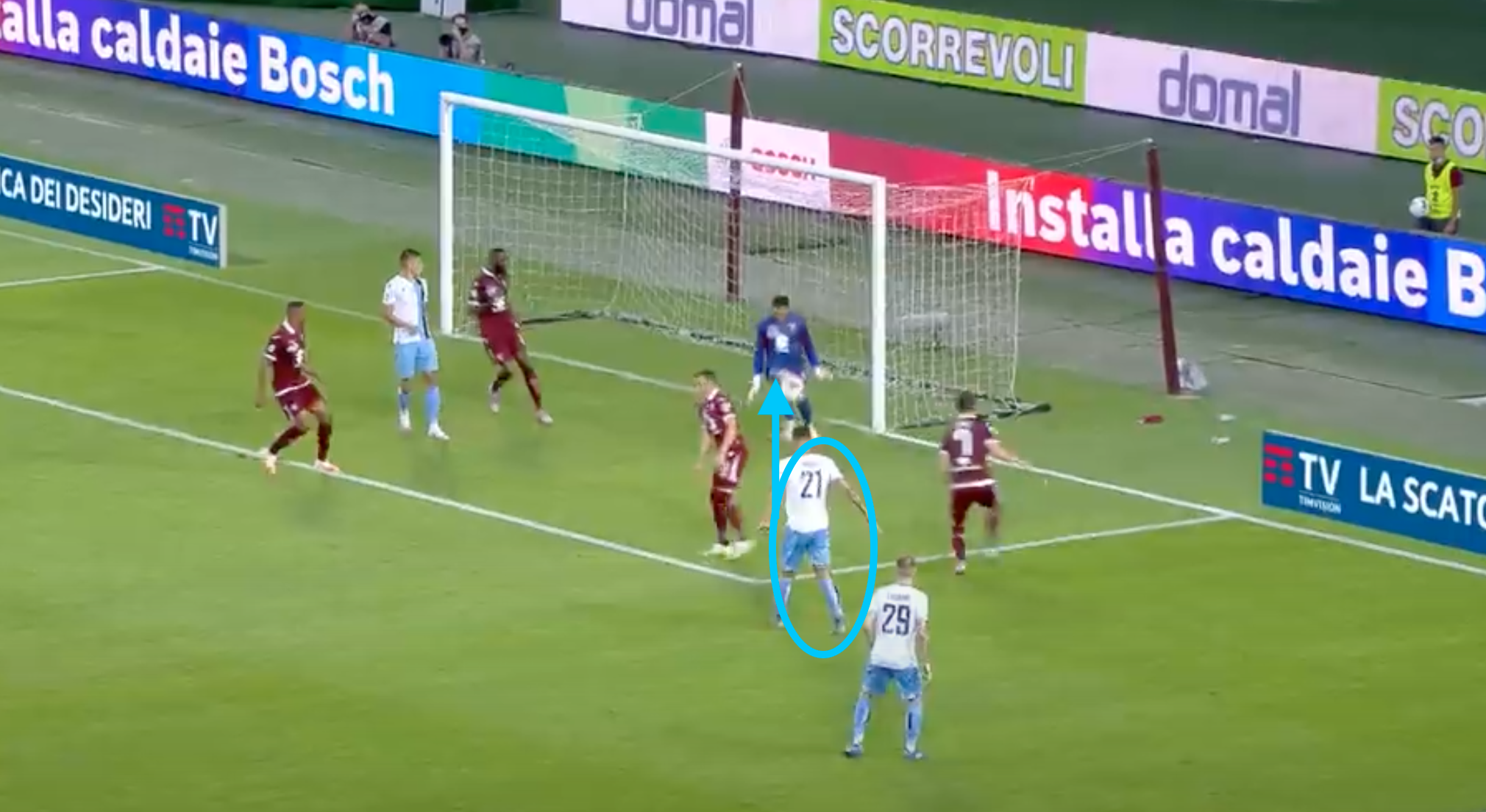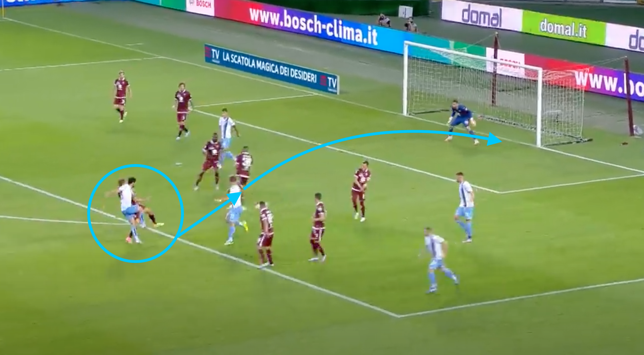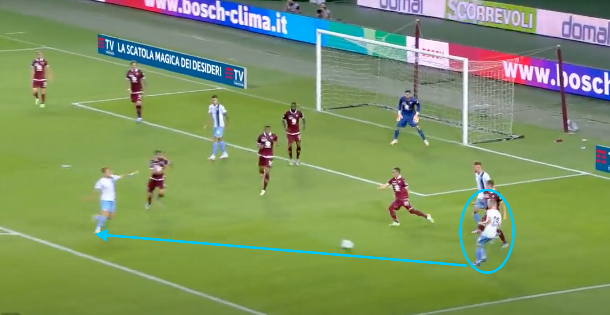 La sfera arriva così sui piedi di Lazzari che serve centralmente per Immobile, che stava arrivando a rimorchio. Bravo in questa circostanza Rincon a intervenire con i tempi giusti e a sporcare la sfera.