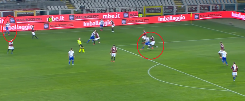 Il secondo gol della Sampdoria è quello più assurdo nella serata granata. Moreno Longo chiama il cambio, fuori Aina e dentro Ansaldi. Pronti-via, i blucerchiati battono la rimessa laterale, velocemente.