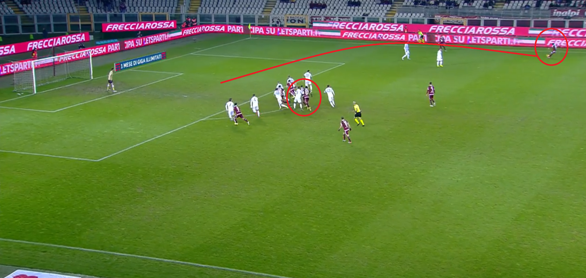 L'azione si è poi sviluppata sulla destra, con un cross verso Petagna e l'area di rigore: la difesa del Toro non è riuscita a spazzare bene, e si è presentato Strefezza sul pallone.