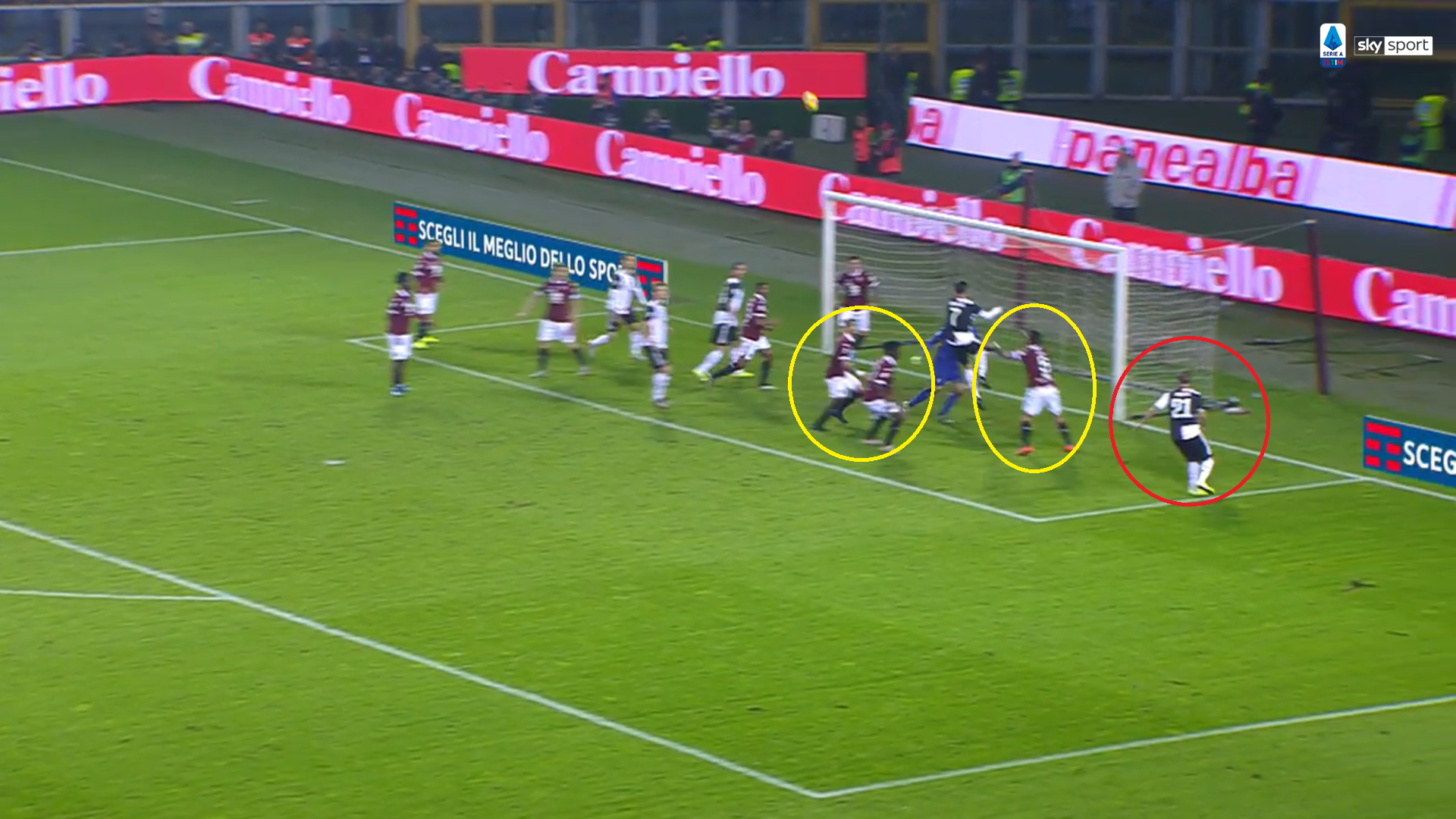 Ciò che ha messo in difficoltà il Toro è stato il calcio d'angolo battuto da Pjanic sul secondo palo: Izzo, che doveva coprire su Higuain, lascia spazio di manovra all'argentino che sa di dover allargarsi seguendo alla perfezione quello che appare uno schema classico ma efficace.