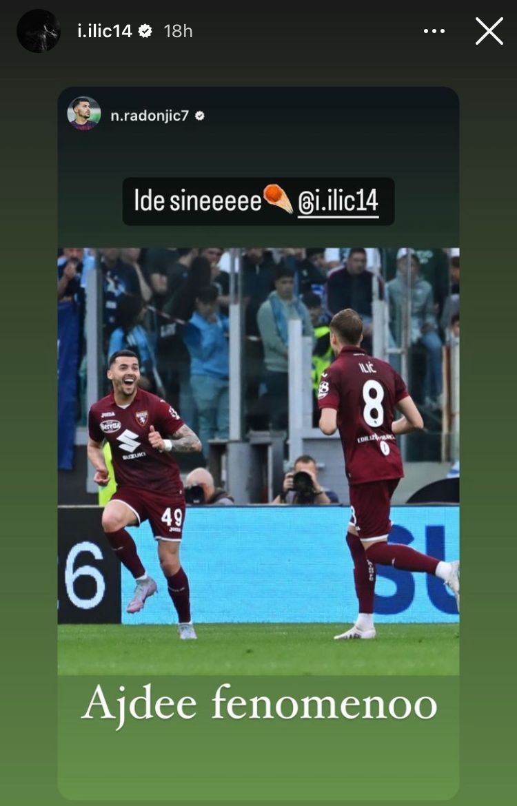 La festa più grande tra i giocatori del Toro è arrivata tra due componenti della parte serba di spogliatoio, vale a dire Nemanja Radonjic e Ivan Ilic. L'esterno ex Benfica ha pubblicato una foto di loro due assieme con scritto in serbo: "Vai figliolo" e subito è arrivata pronta la risposta, sempre nella loro lingua madre, del centrocampista ex Verona: "Dai fenomeno".