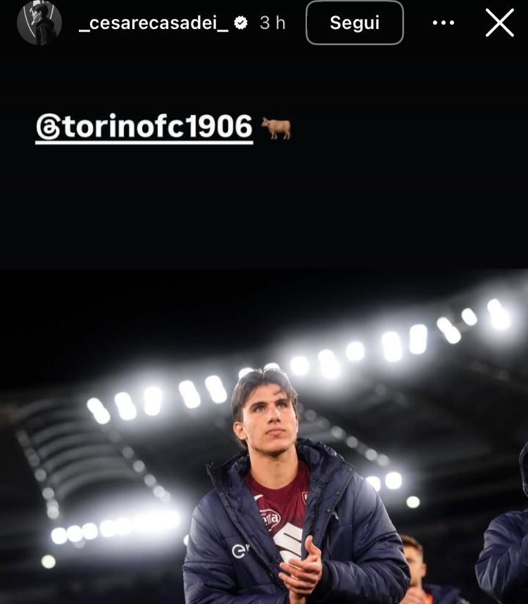 Presente nelle stories anche Cesare Casadei che ha mostrato una foto del postpartita nella quale va a salutare i tifosi granata e ad applaudirli. Ha poi aggiunto l'emoji di un toro come a voler sottolineare la sua dedizione per la causa Torino e il suo ringraziamento ai tifosi presenti per questa trasferta nella capitale.