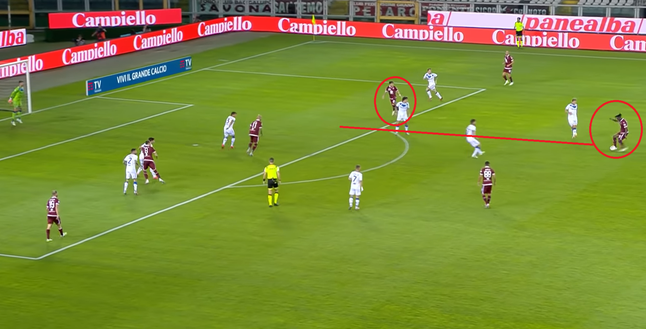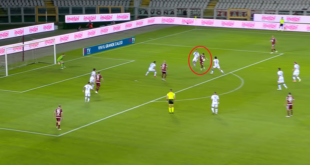 L'attaccante, che sicuramente ha messo a segno col Brescia la sua miglior prestazione in granata, ha gestito molto bene il pallone con la coscia, direzionandosi verso la porta del Brescia.