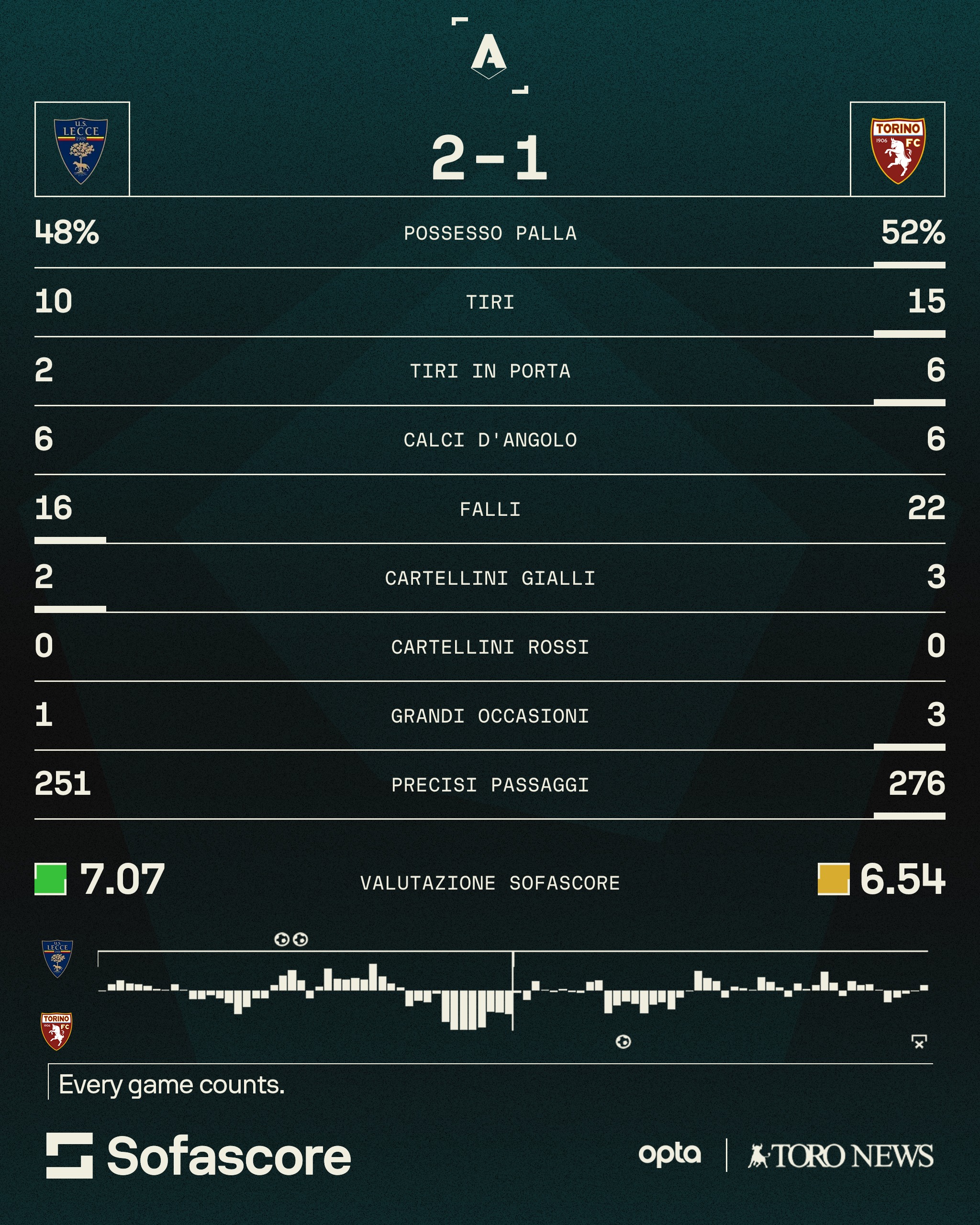 Il Toro ha tirato di più (15 conclusioni contro 10) e meglio negli ultimi 30 minuti, ma ha centrato lo specchio solo 6 volte, contro le 2 dei salentini. La differenza sta tutta nella qualità delle occasioni: il Torino chiude con 1,74 expected goals, il Lecce con 1,00 ma realizza due reti sfruttando al massimo il primo tempo. Infatti nella prima frazione di gara gli expected gol sono 0.83 per i pugliesi rispetto ai 0.80 dei piemontesi. I granata nella ripresa sprecano tanto nonostante 18 tocchi in area avversaria contro i 15 giallorossi. Anche sul piano delle “grandi occasioni” il confronto è equilibrato: il Torino manca tre occasioni nette contro una sola del Lecce. Numeri che parlano chiaramente: produzione alta, conversione insufficiente.