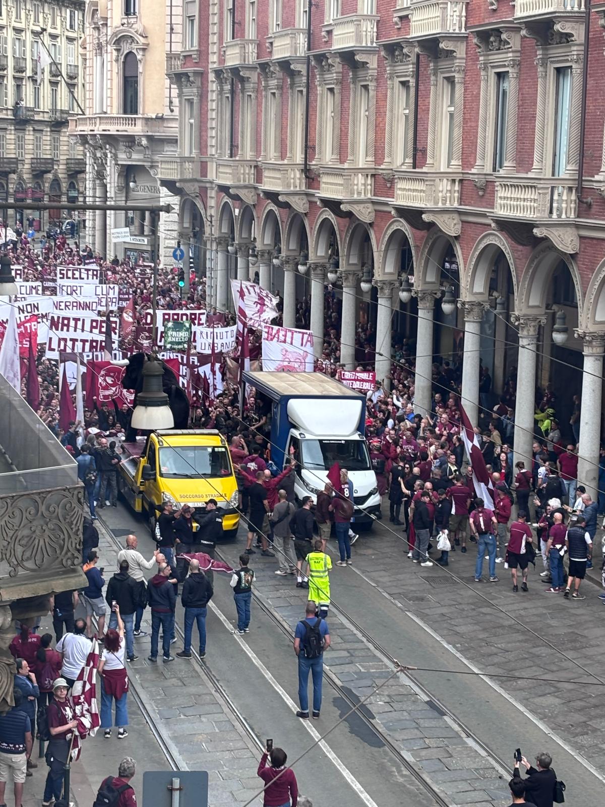 11.58 Il corteo è ormai in Piazza Vittorio. "Puoi girare il mondo quando vuoi, ma i granata veri siamo noi" questo il coro lanciato dal popolo granata.