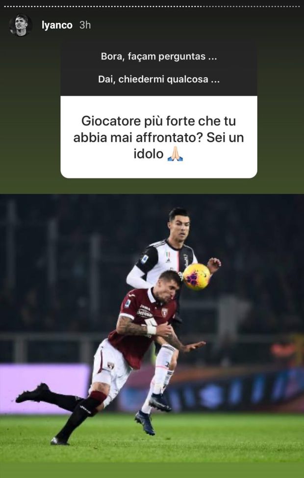 Per quanto riguarda il giocatore più forte mai affrontato, Lyanco lascia parlare le immagini. A domanda specifica, la sua risposta è stata uno scatto di un'azione di gioco nel quale ha contrastato il numero 7 della Juventus, Cristiano Ronaldo.