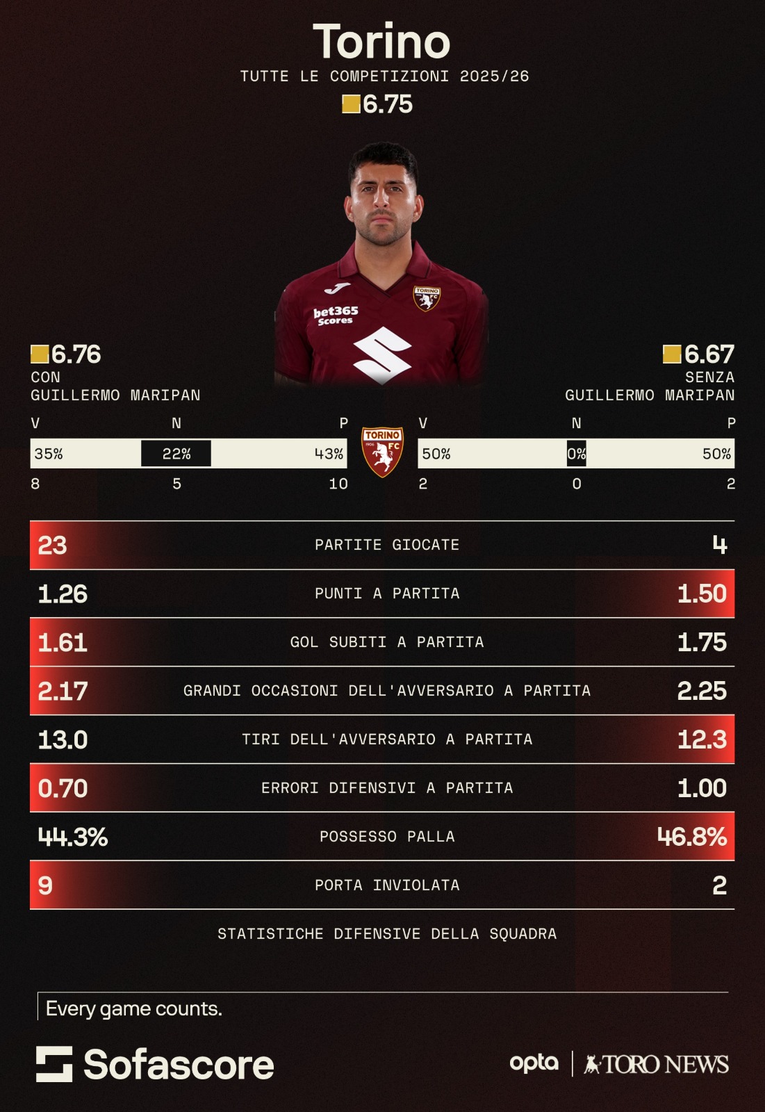 —Già con Vanoli nella passata stagione era chiara l'importanza del giocatore. Ora con Baroni l'evidenza è ancora più netta, soprattutto perché c'è un Torino con Maripan in campo e un Torino senza il cileno. Secondo quanto raccolto dai dati di Sofascore, i 9 clean sheet stagionali collezionati dal Torino sono arrivati con il difensore in campo. Senza? Solo due volte il Torino ha mantenuto la porta inviolata. Considerando la curiosa dicotomia del Torino — peggior difesa del campionato ma leader per clean sheet — l'impatto di Maripán emerge con forza, confermando come la sua presenza sia l'ago della bilancia per la solidità granata. Proprio per questo motivo va anche citato il dato relativo alle grandi occasioni concesse con e senza il cileno: 2.17 con Maripan titolare contro le 2.25 senza il classe 1994. Continuando, anche il dato relativo agli errori commessi con il difensore in campo si abbassa: 0.70 rispetto a 1.