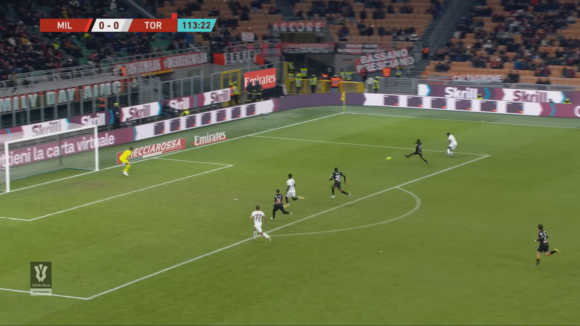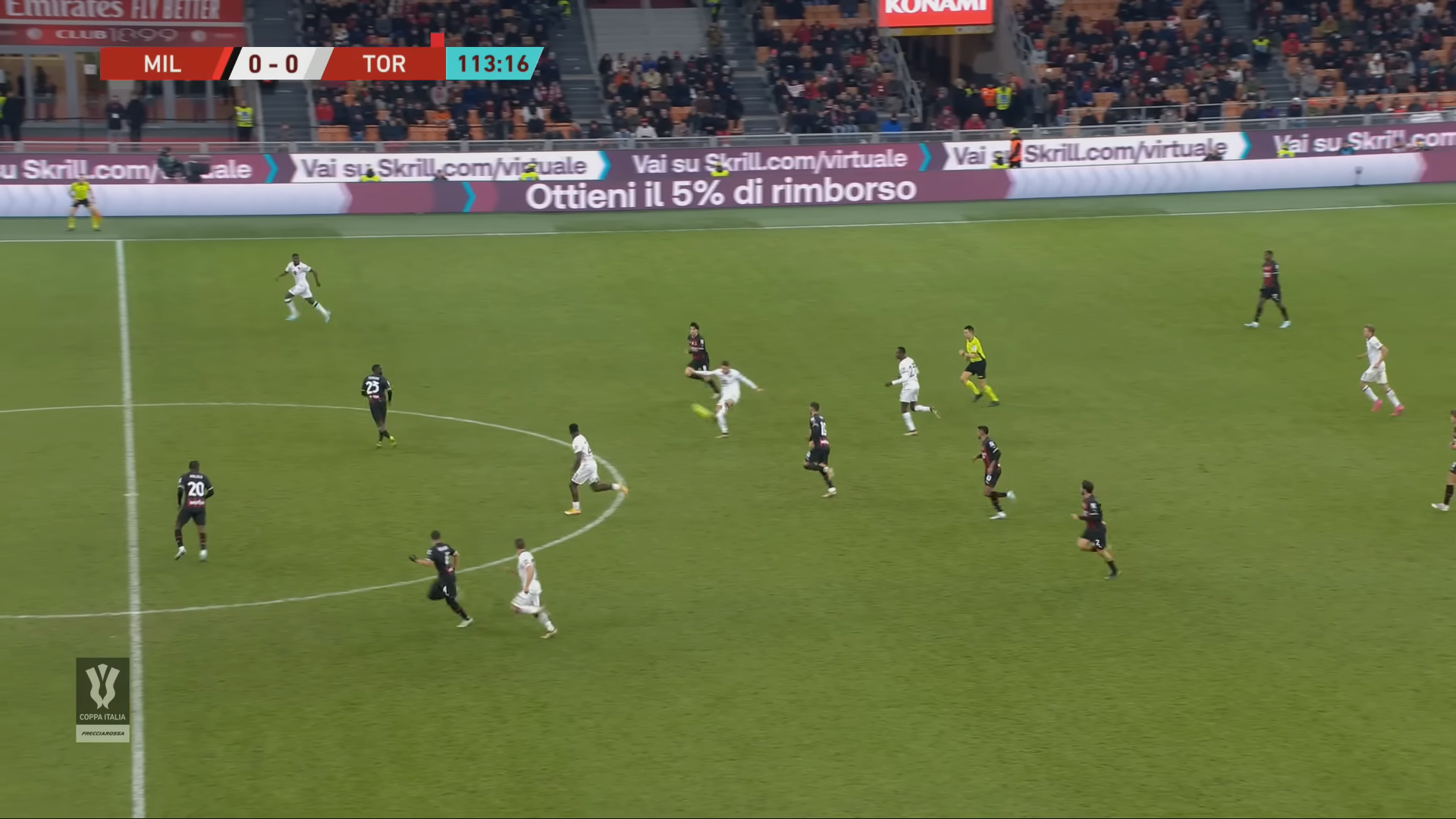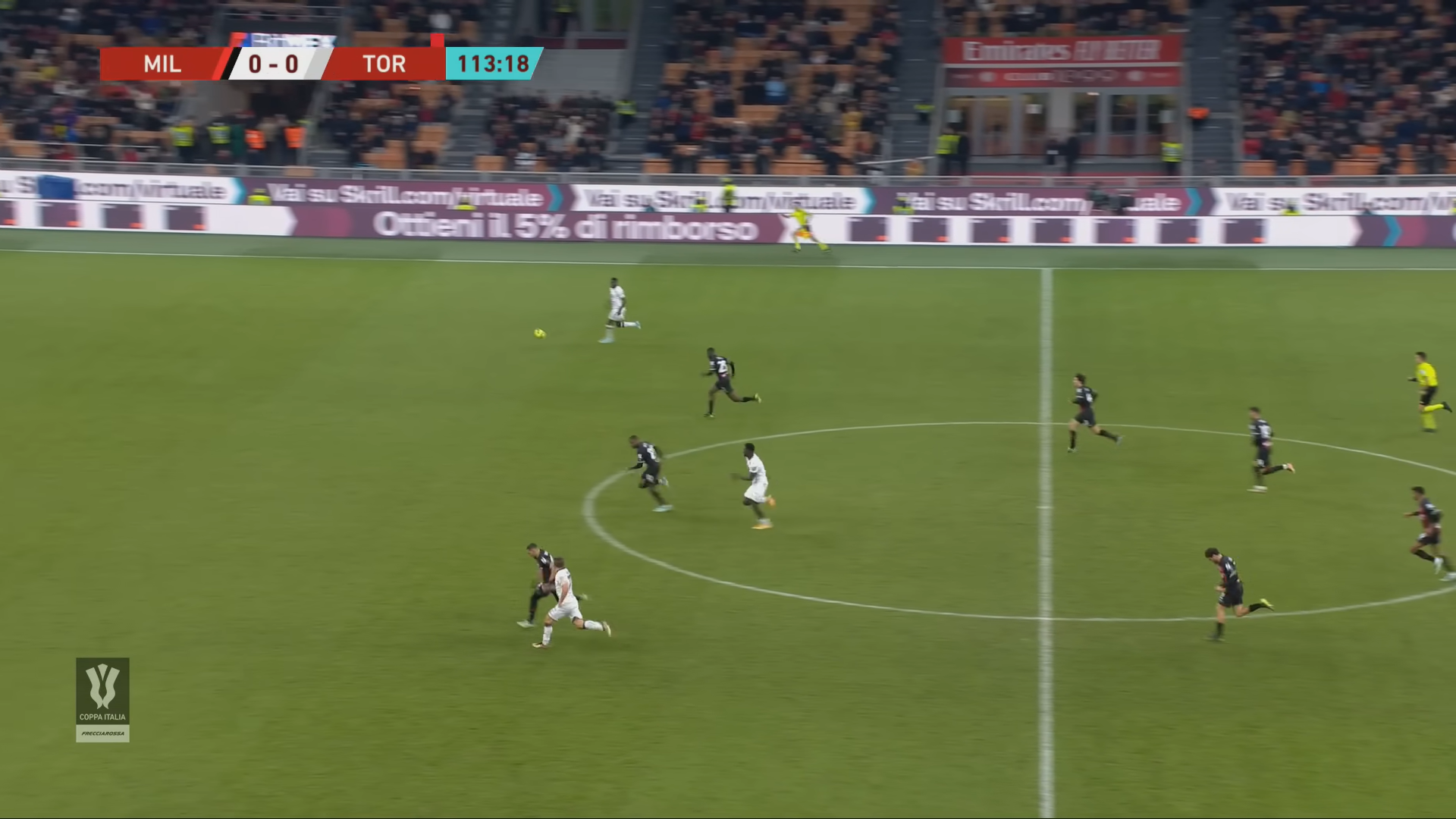 Al 113' di gioco il Toro si ritrova da diversi minuti schiacciato nella propria metà campo a causa dell'inferiorità numerica e del maggior tasso tecnico del Milan. I granata riescono però a resistere e a fermare ogni potenziale occasione dei rossoneri e hanno un'occasione per ripartire in contropiede. Nell'immagine 1 si può notare che durante un palla contesa nei pressi del cerchio di centrocampo, Lukic è bravo a lanciare in profondità l'appena entrato Bayeye.