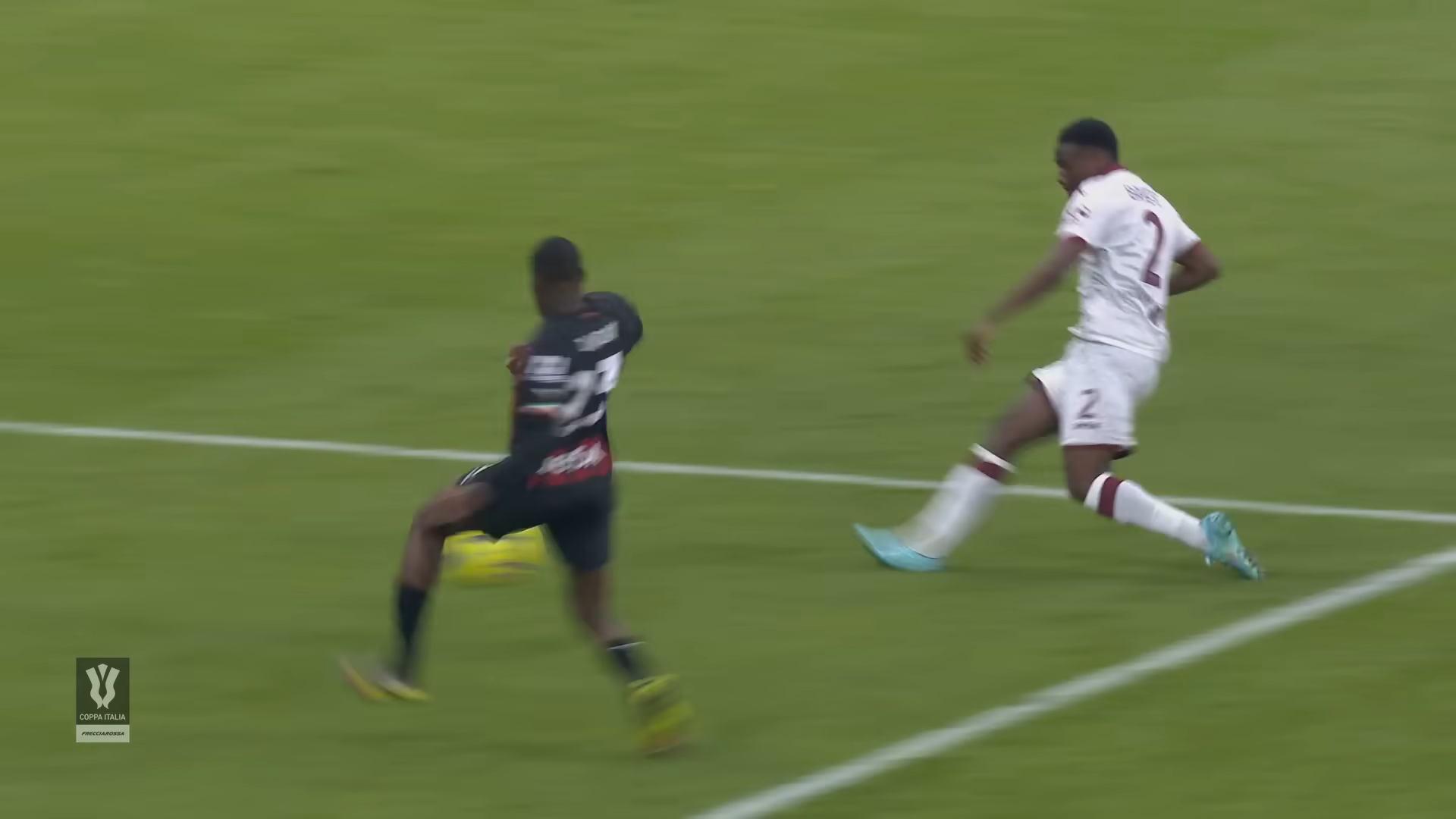Una volta entrato in area di rigore, Bayeye è poi stato molto lucido ad alzare la testa e a servire con precisione Adopo al centro dell'area. Vicino a lui stava arrivando Tomori ma il 2 granata ha crossato prima che l'avversario riuscisse a raggiungerlo e a contrastarlo.