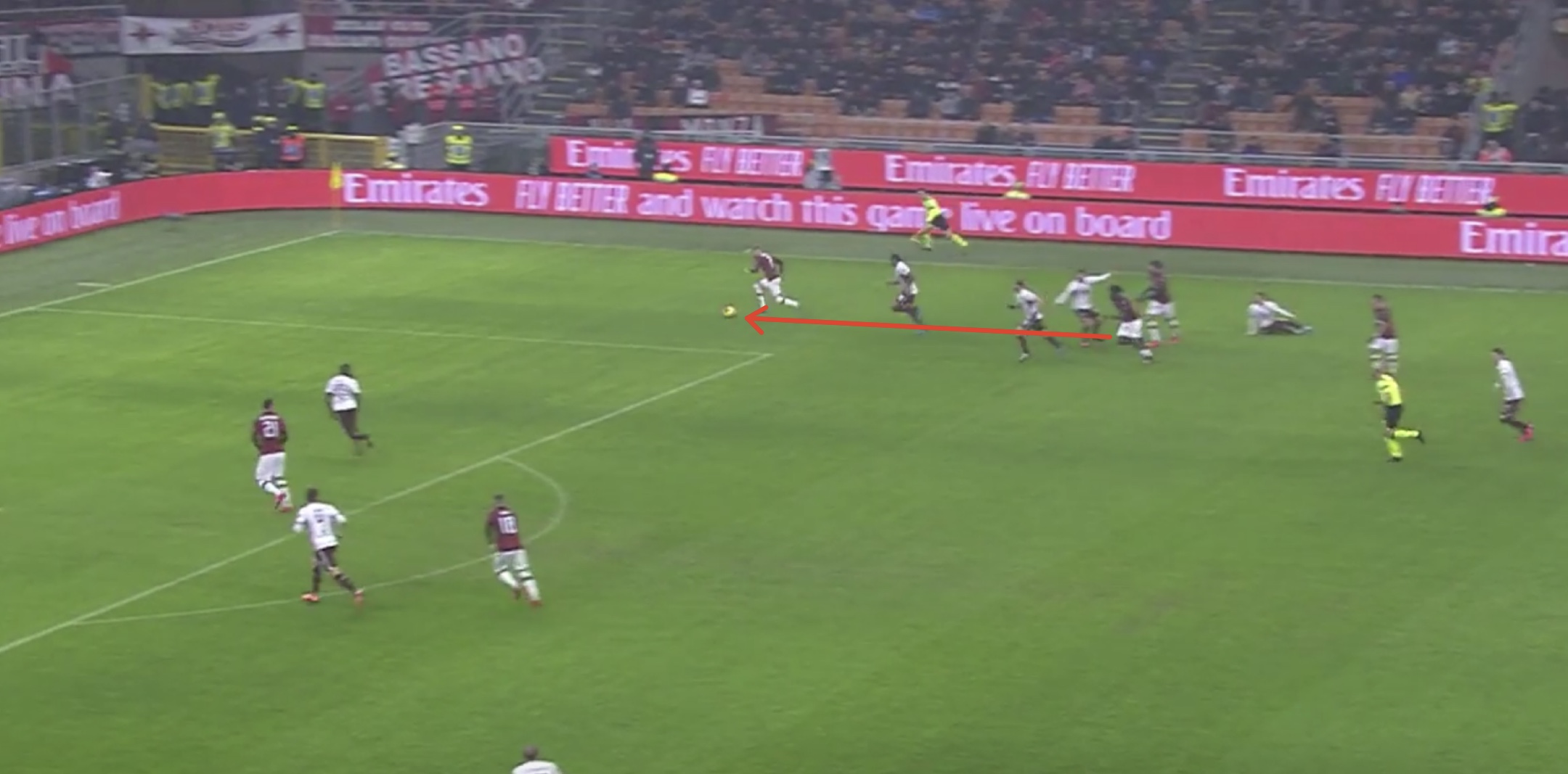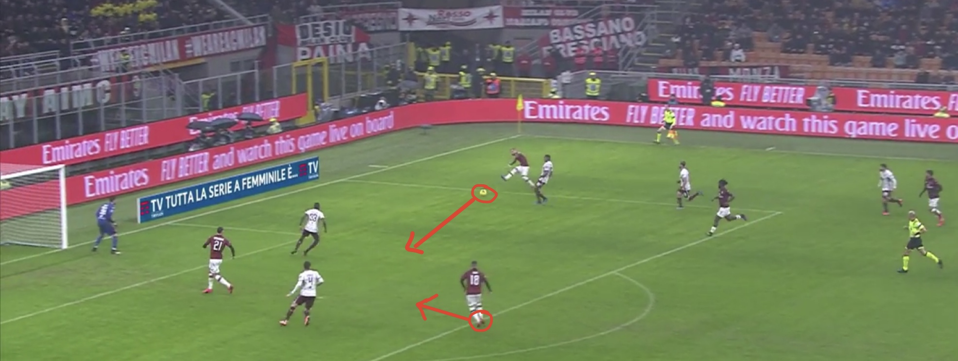Lo spagnolo riceve la sfera e parte in velocità, seminando tutta la difesa granata che lo rincorre. L'ala rossonera si porta verso il fondo nella posizione ideale per fare un cross in mezzo.