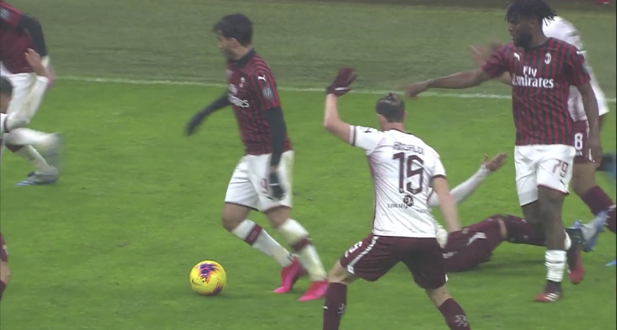 Altra sconfitta del Torino nel campo di San Siro contro il Milan (la quinta consecutiva in campionato). Il gol nasce al minuto 24 del primo tempo, con i granata che provano ad uscire palla al piede dal pressing rossonero, il pallone arriva a Berenguer che viene chiuso da due giocatori del Milan. Castillejo colpisce solamente la gamba destra del numero 21 granata che, quindi, perde equilibrio e pallone. L'arbitro non fischia il fallo (clicca qui per leggere la moviola) e così Calabria riesce a lanciare lo stesso Castillejo sulla fascia.