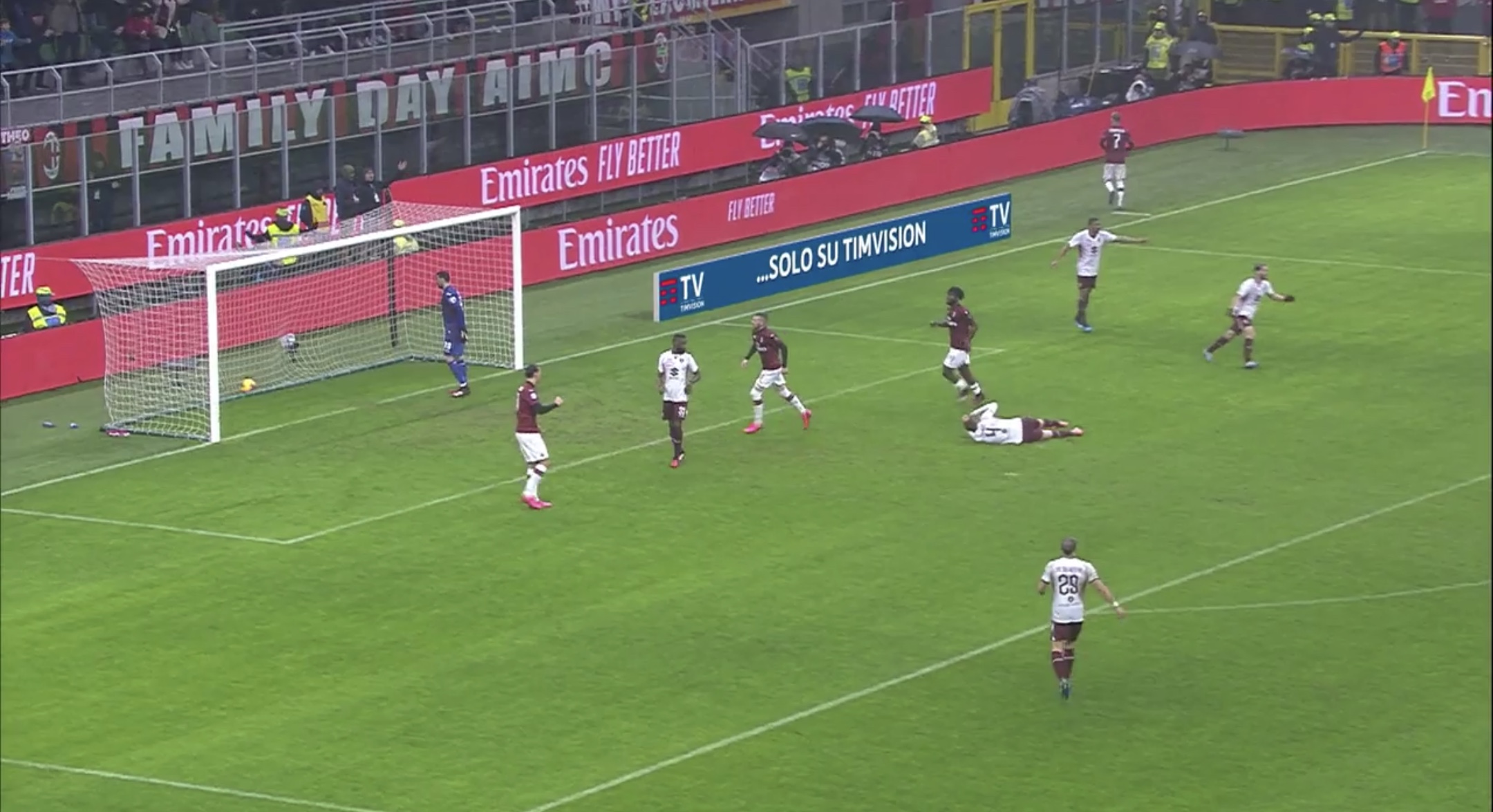Dalle immagini si nota come la presenza di Ibrahimovic al centro dell'area di rigore attiri le attenzioni di entrambi i giocatori del Torino, con Lyanco che arriva colpevolmente in ritardo sul suo uomo. Tutto troppo facile per Rebic.