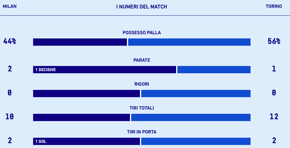 EFFICACIA - Snocciolando gli altri numeri si nota che gli ospiti hanno colpito 2 legni, mentre il Diavolo neanche uno. I piemontesi si sono guadagnati anche 5 corner a differenza dei 2 dei padroni di casa. Ma nel primo dei due corner i rossoneri hanno trovato la via del gol. Il Toro si è dimostrato poco concreto e non ha saputo sfruttare con marcature il controllo del pallino del gioco a San Siro. E' stato poco efficace, a differenza degli avversari che sono stati cinici. Il Milan non era la squadra più semplice da affrontare, e ce lo dice anche il primo posto in classifica. Però non è la prima partita in cui il Torino raccoglie meno di quello che crea e il trend dev'essere invertito da parte della squadra di Juric