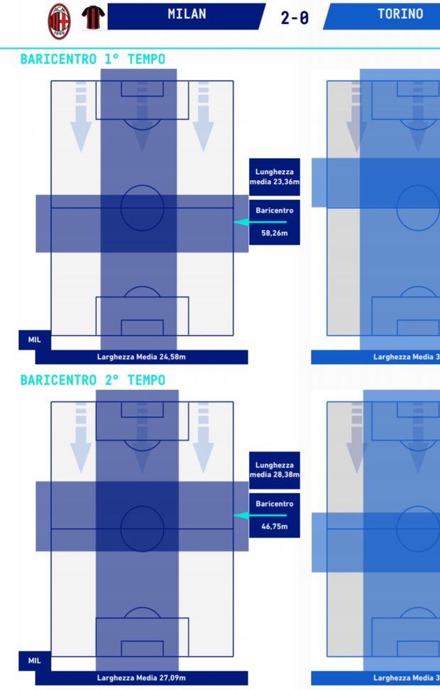 STRATEGIA - Nel primo tempo i granata hanno nettamente lasciato ai rossoneri il pallino di gioco. Al contrario, nella seconda frazione, è del 56,6% il possesso palla granata: la formazione di Marco Giampaolo ha alzato il baricentro e giocato un maggior numero di palloni. Questo risulta più evidente analizzando i dati sull'altezza media del baricentro di Milan e Torino. Nei primi 45' di gioco i rossoneri si sono mantenuti sui 58,26 metri, oltre la linea di metà campo. Mentre i granata si sono stabiliti sui 41,57 metri, rimanendo schiacciati nella propria metà campo. I dati si sono quasi invertiti nel secondo tempo: 46,75 metri per la formazione di Stefano Pioli, contro i 57,39 metri del Torino. Ciò, però, non ha fatto altro che portare un risultato e una prestazione tutt'altro che positivi a Giampaolo e alla squadra.
