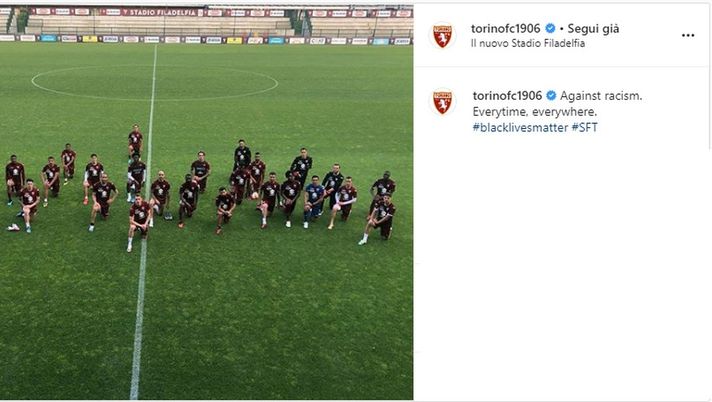 "Bellissimo gesto del Torino che si schiera apertamente contro il razzismo. Seguendo le orme del Liverpool, anche la squadra granata, durante l'allenamento di oggi pomeriggio al Filadelfia, ha posato per una foto altamente simbolica che è stata diramata sul canale Instagram della società granata. I giocatori del Torino, con in testa il capitano Belotti e insieme al tecnico Longo, si sono inginocchiati nella postura vista spesso nelle ultime ore in memoria di George Floyd, l'afroamericano ucciso da un poliziotto a Minneapolis (Stati Uniti d'America). "Contro il razzismo, in ogni tempo e in ogni luogo", è la didascalia a corredo della foto, con tanto di #blacklivesmatter, a testimoniare il supporto al movimento "Black Lives Matter", nato nel 2013 negli Stati Uniti per i diritti della comunità afroamericana. In questa battaglia c'è anche il Torino. Nella giornata di ieri, alcuni giocatori avevano già manifestato singolarmente l'appoggio per la lotta al razzismo.