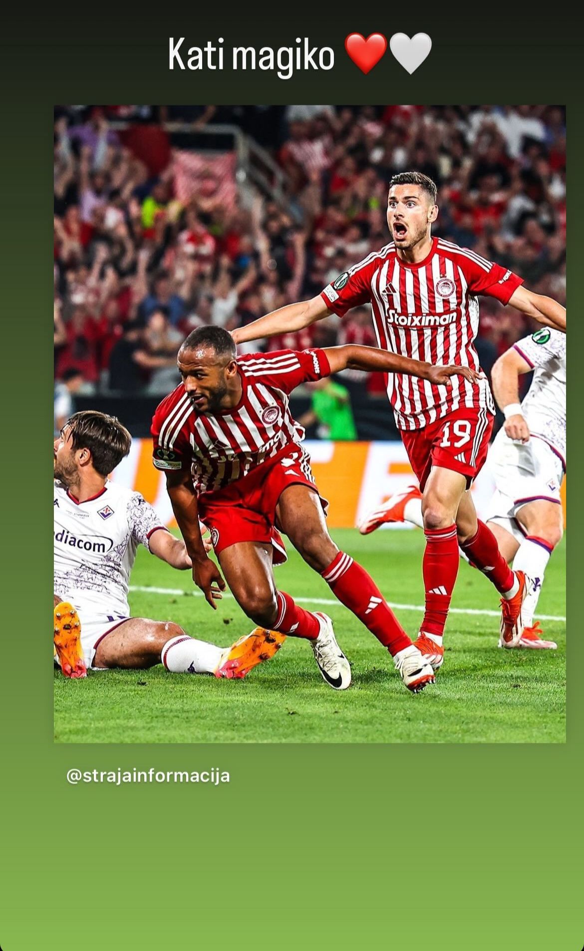 Sorprende il messaggio social del calciatore serbo che ha celebrato la vittoria dell'Olympiakos in Conference League contro la Fiorentina