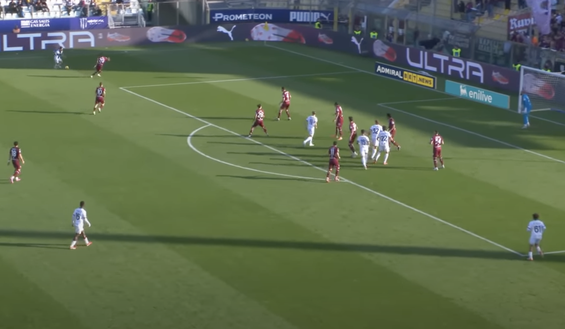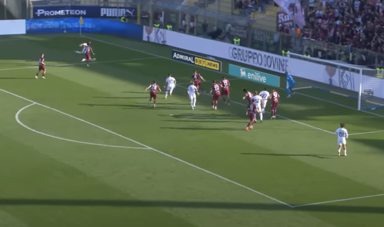 Il Parma pareggia con Pellegrino. La difesa granata marca a zona in area. Sulla sinistra intanto Valeri punta Lazaro.