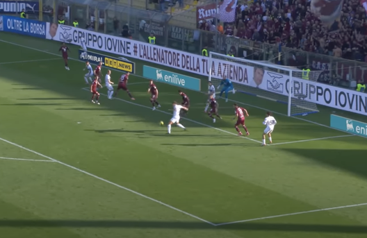 Così a Pellegrino basta spostarsi verso centro area per fregare tutta la retroguardia granata. L'argentino ha tempo di stoppare e calciare. Né Coco né Biraghi fanno in tempo per andare a contrastare il tiro del 32 dei padroni di casa.