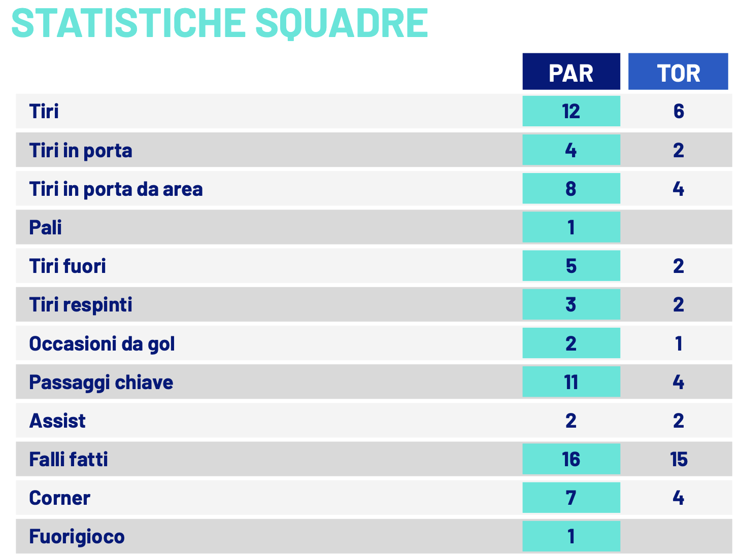 —A livello di possesso palla, il Parma ha tenuto il pallone per il 52% del tempo, con 282 passaggi riusciti (83%), mentre il Torino ha completato 267 passaggi (82%). Tuttavia, i granata hanno avuto più difficoltà nella costruzione offensiva, riuscendo a completare solo 38 passaggi nell'ultimo terzo di campo, contro i 63 del Parma. Il Torino ha saputo colpire con precisione, ma il Parma ha mostrato maggiore continuità e intensità nel corso dei 90 minuti. Un risultato giusto per quanto visto in campo, con entrambe le squadre che hanno avuto le loro occasioni per vincere.
