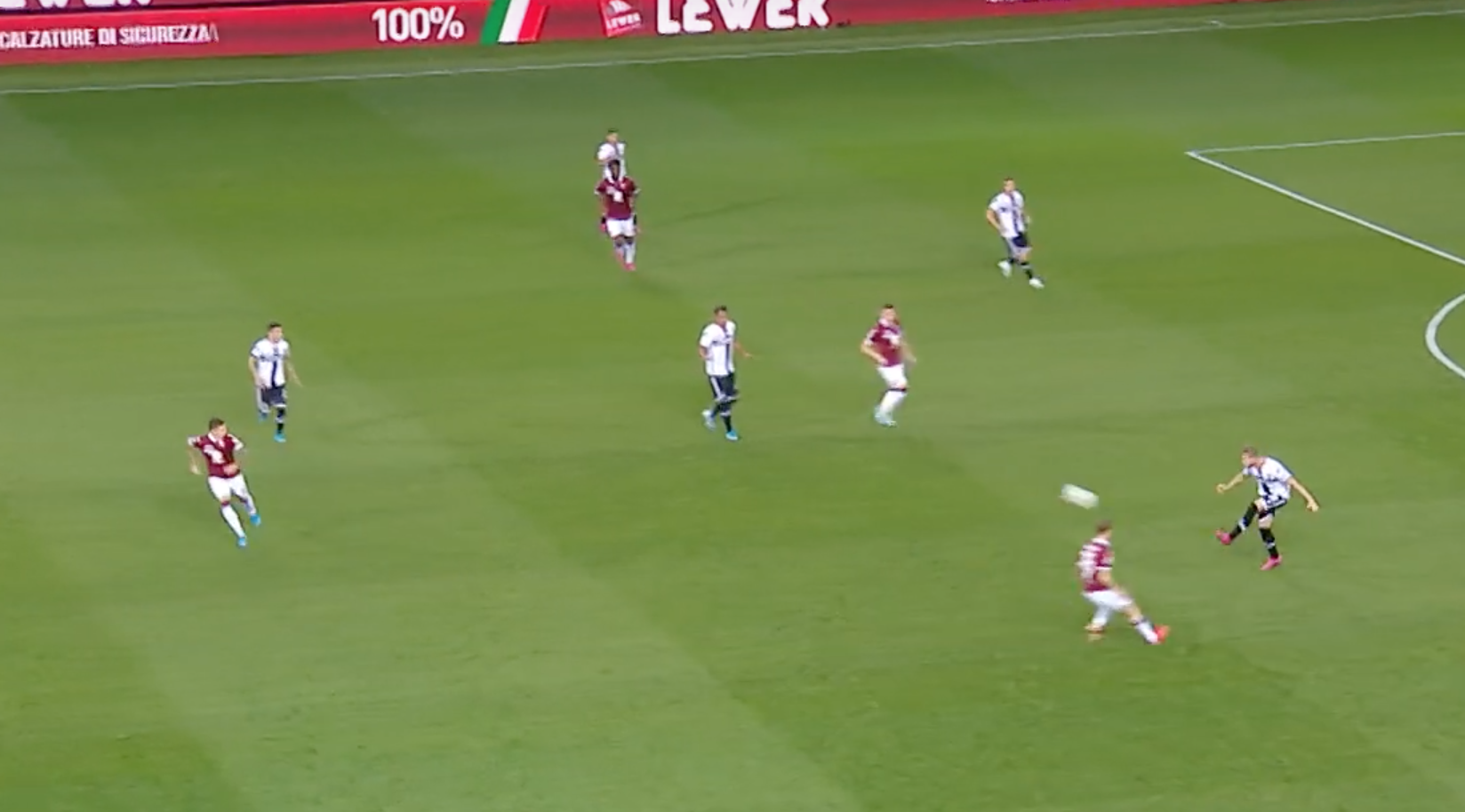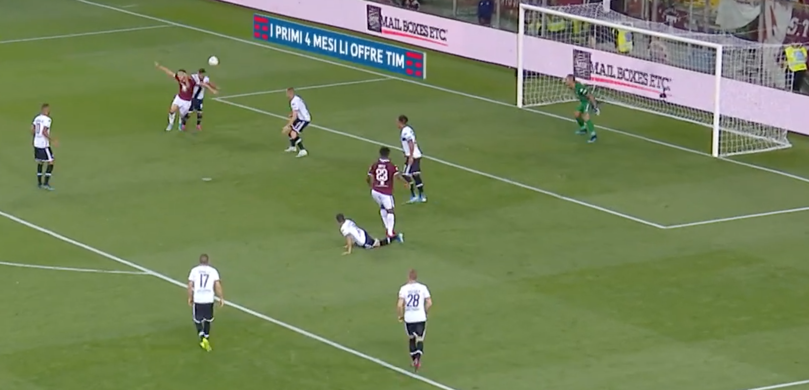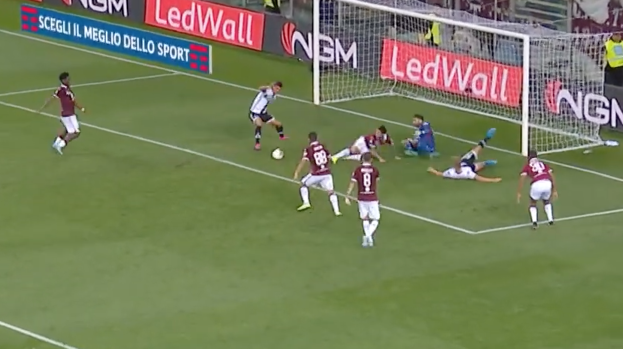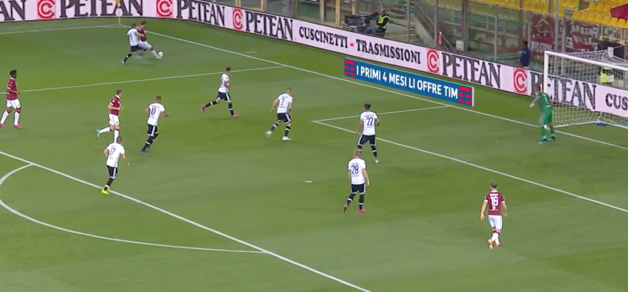 Il pareggio del Torino arriva poco dopo ed arriva su una ripartenza orchestrata inizialmente da Simone Verdi. Belotti stoppa bene palla sulla sinistra e appoggia per Verdi, nel frattempo spostatosi a sinistra, che può così puntare Laurini.