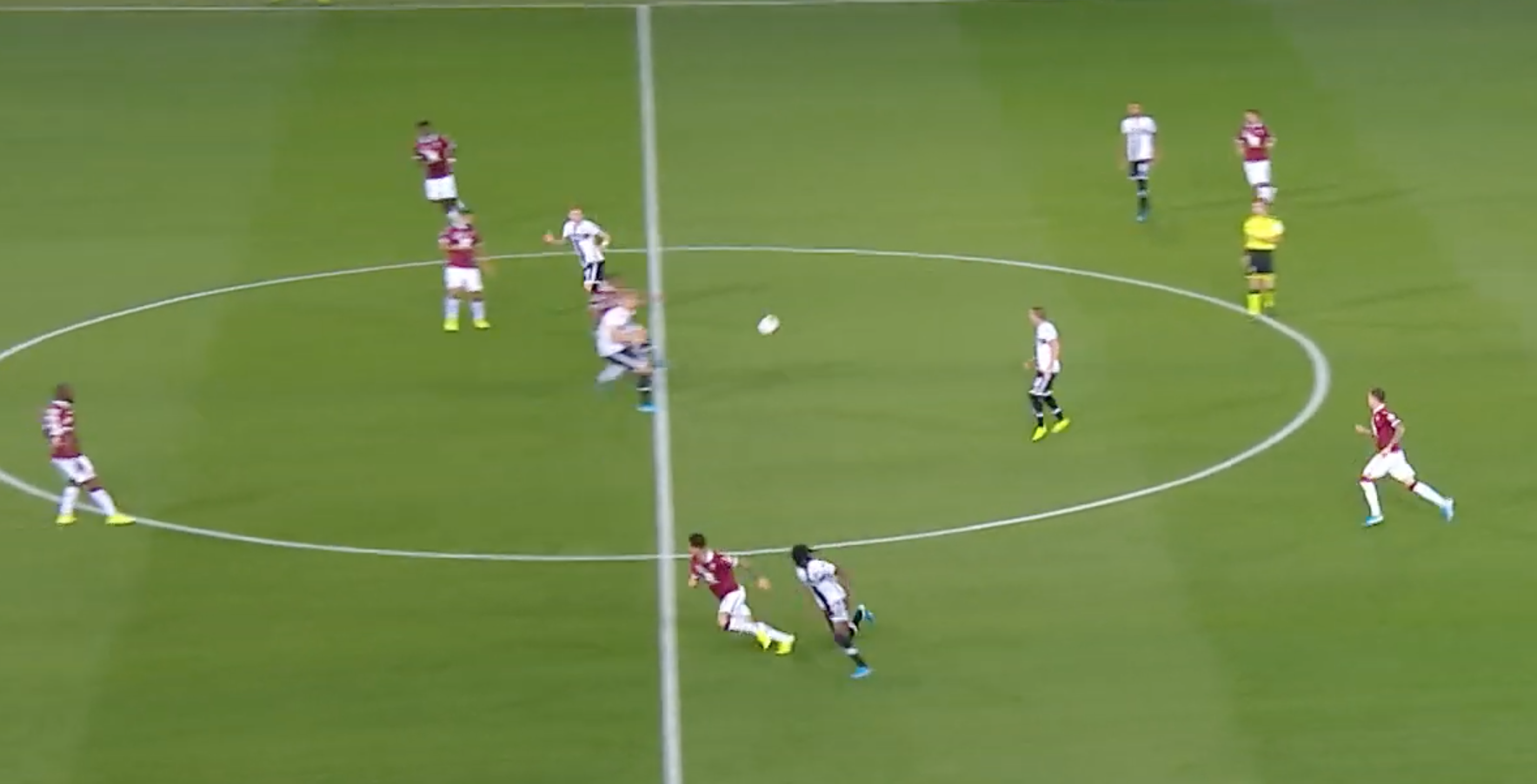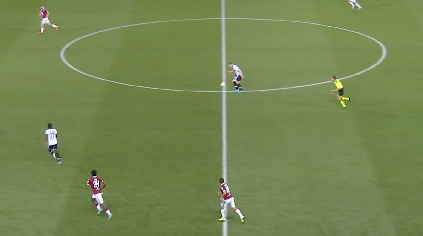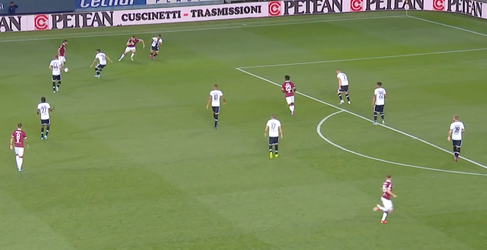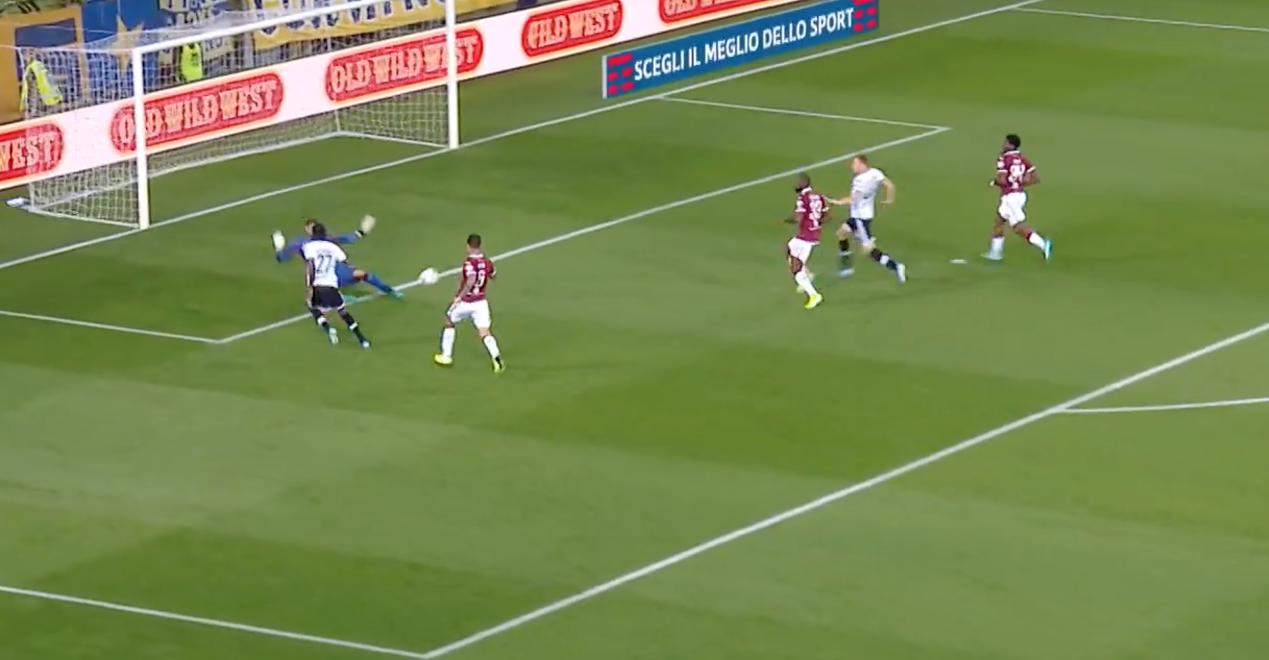 L'attaccante del Parma viene disturbato da Bremer e la palla giunge a Barillà tutto solo a centrocampo, considerando anche il ritardo di Baselli nell'andare a coprire sul centrocampista dei ducali.