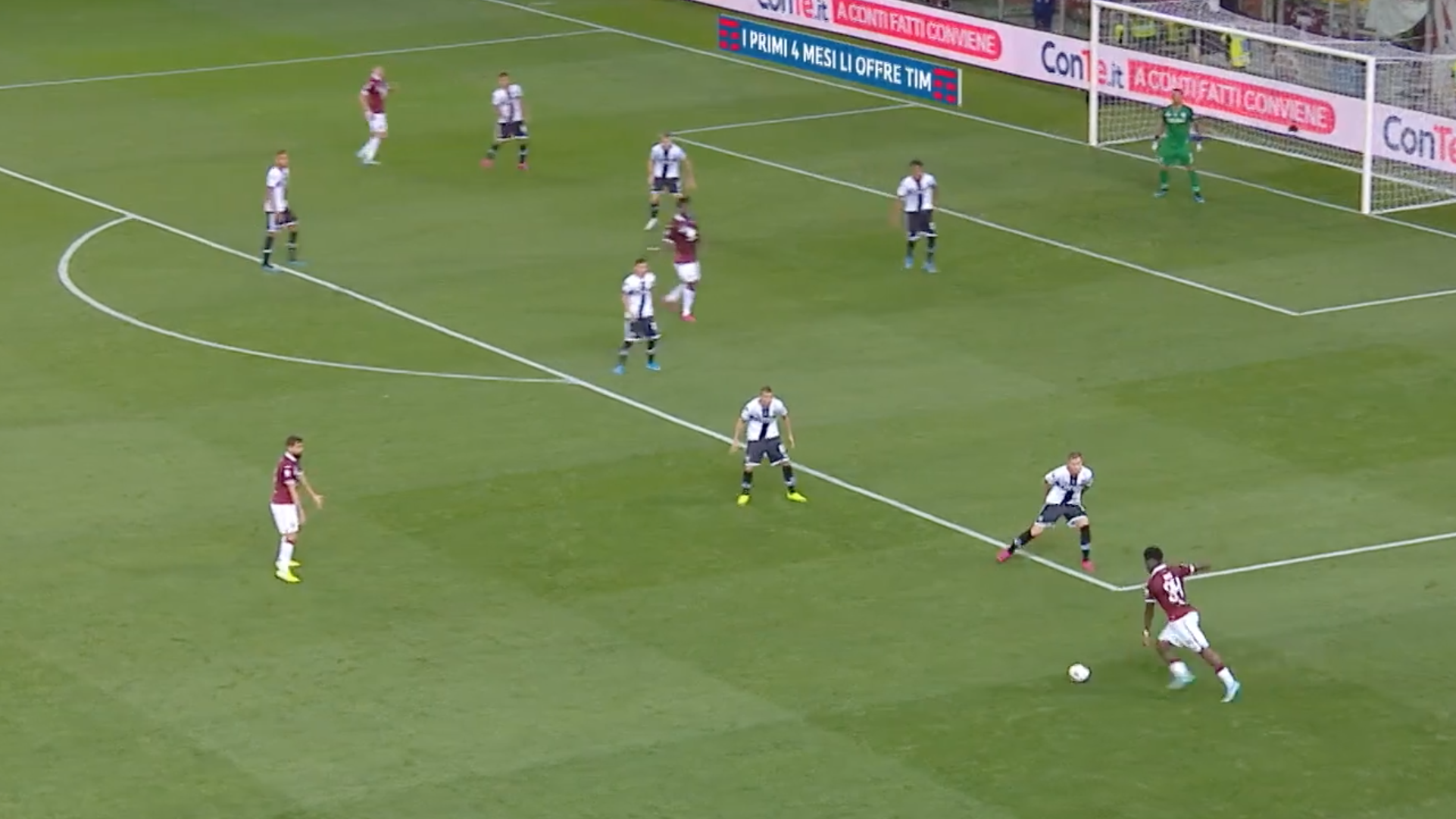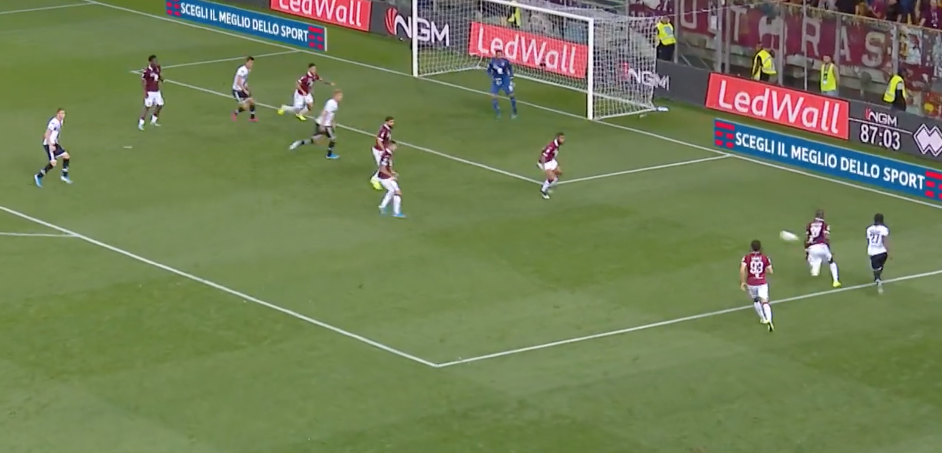 Il secondo gol del Torino nasce dalla destra, dove c'è un Gagliolo non in partita. Ola Aina riceve palla e rientra sul sinistro per mettere in mezzo per Belotti.