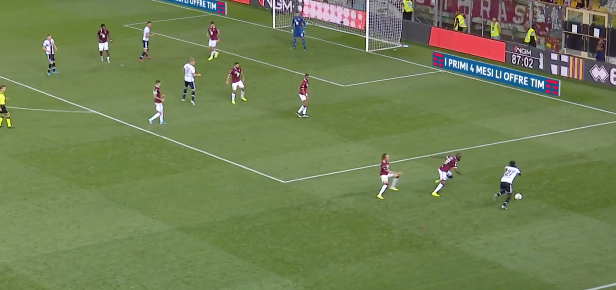 L'ex Primavera dell'Atalanta ha tempo e spazio per partire in progressione e pensare alla giocata migliore, ovvero un'imbucata nel corridoio tra Nkoulou e Izzo per servire il taglio di Cornelius.