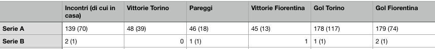STATISTICHE - Nelle ultime cinque partite di campionato tra i granata e i viola, giocate all'ombra della Mole, entrambe le squadre hanno trovato la rete: 14 gol nel parziale, 2.8 di media a partita. Negli ultimi 20 precedenti in Serie A tra le due squadre - sia in casa che in trasferta - i gigliati hanno segnato nelle ultime 19 sfide. In questo parziale i toscani hanno subito solo due sconfitte (dieci vinte, otto pareggiate). Gli ultimi precedenti non fanno ben sperare al Toro che comunque è in cerca di conferme dopo la vittoria con il Genoa e non si può permettere ulteriori errori dopo un inizio campionato deludente.