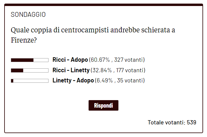 In mediana c'è un dubbio da sciogliere in vista di Fiorentina-Torino, dato dall'assenza di Sasa Lukic. Chi dovrebbe sostituire il serbo e per quale duo dovrebbe optare Ivan Juric nella gara contro la Viola? Lo abbiamo chiesto ai lettori di Toro News, che hanno dato una netta preferenza. Oltre la metà dei lettori, quasi il 61%, vorrebbe vedere Ricci in coppia con Adopo, affiancando una delle certezze di Juruic all'uomo partita della gara di Coppa Italia contro il Milan. La coppia inedita Adopo-Ricci stuzzica quindi e convince più del collaudato duo composto da Ricci e Linetty, che ottiene il 33% delle preferenze. Meno quotata invece una mediana composta da Linetty e Adopo, con Ricci a partire dalla panchina. Quest'ultima opzione ha raccolto solo il 6% dei consensi.