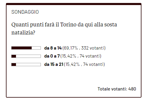 Come ogni settimana, Toro News propone un sondaggio ai propri lettori, i quali possono esprimere la loro opinione. Questa settimana il sondaggio - "Quanti punti farà il Torino da qui alla sosta natalizia?" - riguardava le prossime partite del Toro - contro Udinese, Roma, Empoli, Cagliari, Bologna, Verona e Inter - e quanti punti i granata sarebbero riusciti a conquistare. In base ai risultati, per la maggior parte dei votanti - 332 votanti su 480 - il Torino totalizzerà tra gli 8 e i 14 punti. Per il 15,42%, a pari voti - 74 ciascuno - dagli 0 ai 7 e dai 15 ai 21. Risultati, quelli dei lettori, che fanno ben sperare, data l'influenza che il tecnico Juric ha avuto su tutta la società.