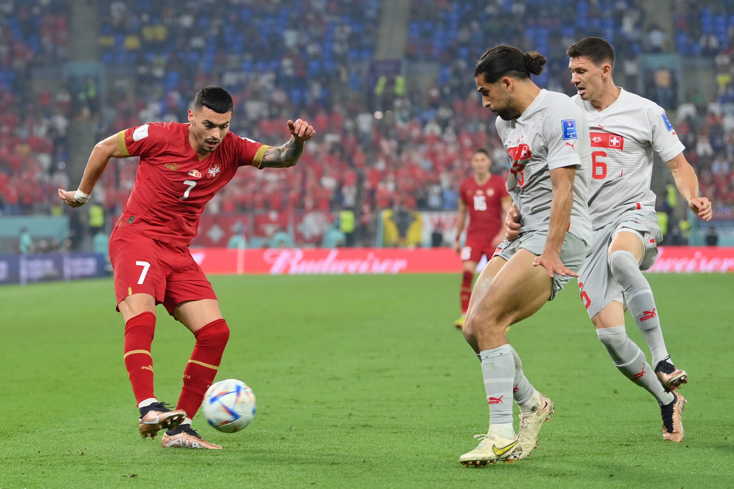 DOHA, QATAR - DECEMBER 02: Nemanja Radonjic of Serbia controls the ball against Noah Okafor of Switzerland during the FIFA World Cup Qatar 2022 Group G match between Serbia and Switzerland at Stadium 974 on December 02, 2022 in Doha, Qatar. (Photo by Francois Nel/Getty Images)
