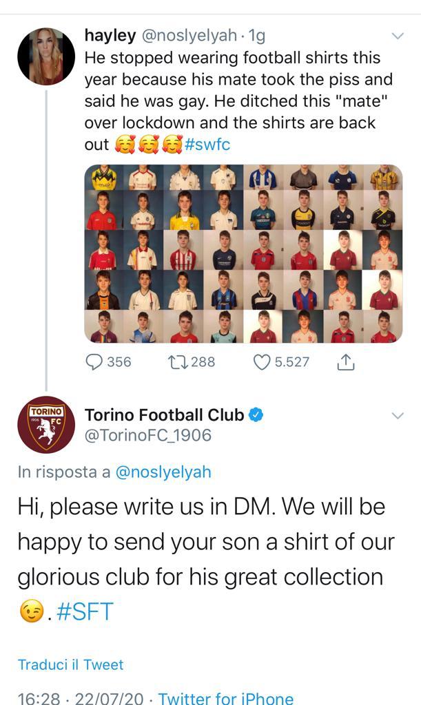 "Ha smesso di indossare magliette da calcio quest'anno perché il suo compagno l'ha preso in giro e ha detto che era gay. Durante il lockdown ha piantato in asso questo amico e le magliette sono tornate fuori", ha denunciato su Twitter una donna inglese di nome Hayley. Prontamente il Torino ha letto la storia su Twitter e si è reso disponibile a fare un gesto per venire incontro al ragazzo che aveva smesso di indossare maglie da calcio. La società granata ha voluto fare un gesto contro le discriminazione e venire incontro al ragazzo, offrendo una maglietta in regalo scrivendo a Hayley il seguente messaggio: "Per favore scrivici in privato. Saremo felici di inviare a tuo figlio una maglietta del nostro glorioso club per la sua grande collezione". Ennesimo gesto contro le discriminazioni del Torino, che ha dimostrato sensibilità sul tema anche il 27 giungo con un post su Instagram dedicato al Pride.