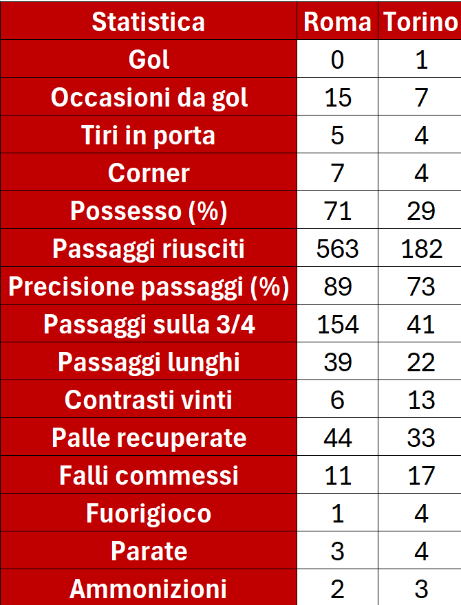 La Roma costruisce, il Torino resiste: il differenziale di possesso e passaggi è ampio, ma nella qualità delle conclusioni i conti si riequilibrano e la gara la decide il dettaglio. È la fotografia perfetta di un Toro ordinato, sporco quando serve e concreto: poche iniziative, ma la giocata decisiva e una fase difensiva di livello portano tre punti pesantissimi.