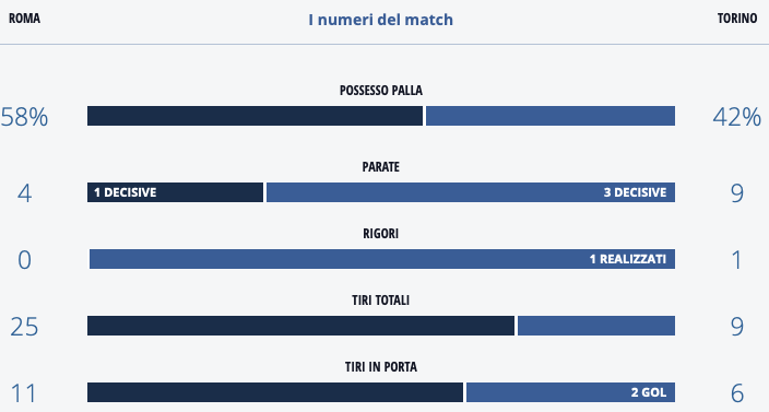 I SINGOLI - Da evidenziare come nell'atteggiamento offensivo dei granata sia stata fondamentale la fascia sinistra. Il bilanciamento offensivo è per il 51% su quella fascia e, se escludiamo un tiro e il gol su rigore, tutte le conclusioni dei granata sono state effettuate dal lato sinistro. Dati che dimostrano come la catena di sinistra sia stata fondamentale nella partita dell'Olimpico, dove si è visto un Ola Aina in grande spolvero. Continuando nell'analisi dei singoli, nel Toro è stato fondamentale Andrea Belotti che è primo per tiri in porta (4), occasioni da gol (4) e passaggi chiave (3). Anche Salvatore Sirigu è stato provvidenziale con le sue 9 parate, di cui tre decisive.