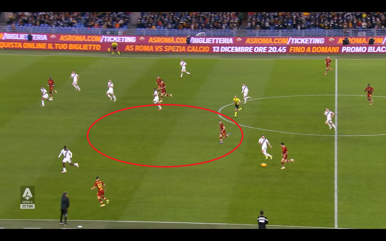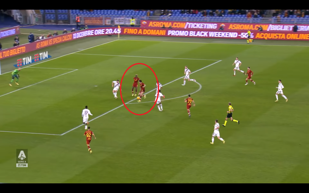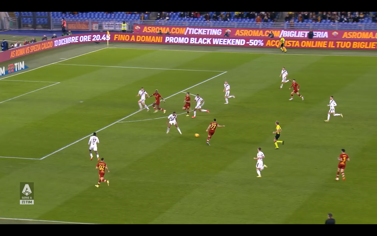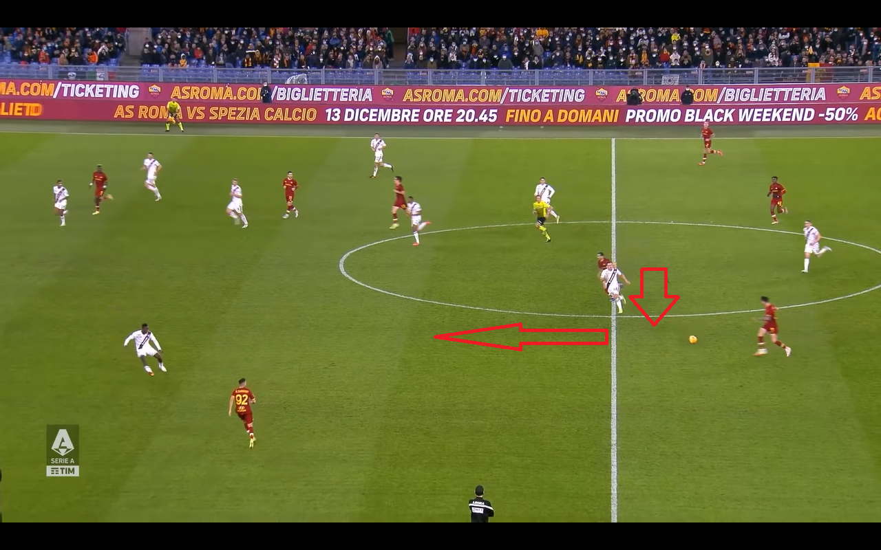 La giocata che manda ancora più in confusione la retroguardia di Juric la compie Zaniolo. Il numero 22 giallorosso sfila dietro a Bremer, che lo perde di vista; finta di andare incontro al pallone e con un velo lascia sfilare la sfera per Abraham (Immagine 5).