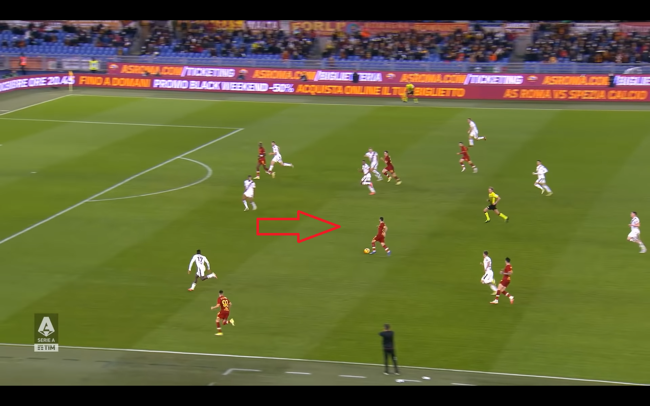 Ibanez ha tutto il tempo per aspettare che Mkhitaryan completi il movimento prima di servirlo in uno spazio vuoto davvero enorme che l'armeno è bravo a sfruttare portando palla in avanti (Immagine 2).