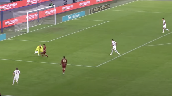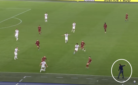 La rete della Roma arriva grazie a una serie di errori di un Toro impaurito e poco coraggioso palla al piede. La squadra di Vanoli patisce la marcatura uomo su uomo e così (soprattutto nel primo tempo) cerca spesso retropassaggi che in questo caso portano al gol. Il primo retropassaggio è di Vojvoda per Linetty, ma la palla del kosovaro è: lenta e leggibile, infatti viene sporcata quanto basta per togliere ulteriore velocità e mettere in difficoltà Linetty. Da notare - inoltre - come Vanoli stesse chiedendo a Vojvoda di cercare una verticalizzazione (nel cerchio in basso a destra).