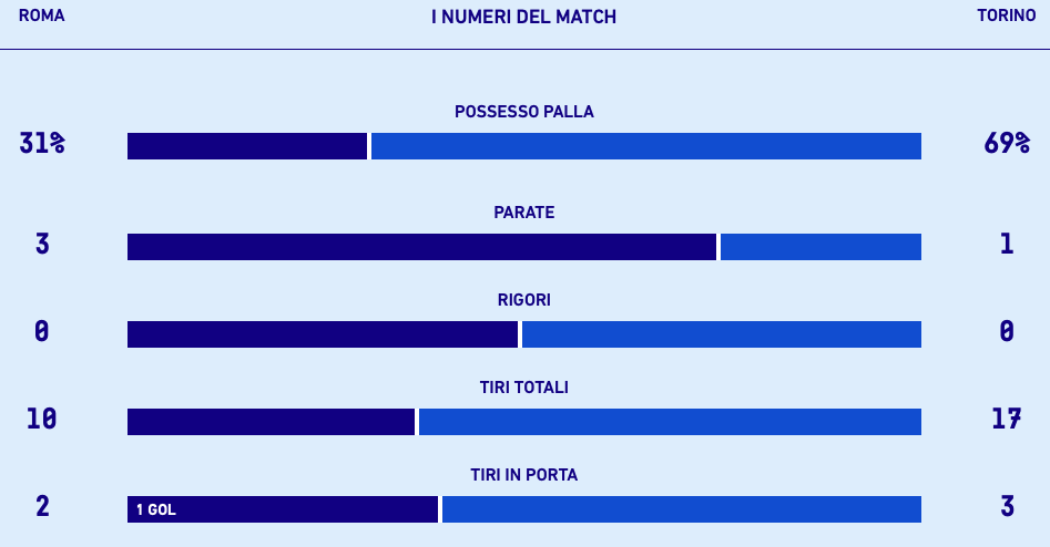 ATTEGGIAMENTO - Andrea Belotti e compagni hanno avuto un baricentro più alto rispetto agli avversari. Nel primo tempo la differenza è stata relativamente poca: 47,47 m per la formazione romana e 53,8 m per quella torinese. Nella ripresa il divario è stato più marcato: 36,59 m per la squadra di Mou e 64,67 m per quella di Juric. Ma resta il fatto che gli ospiti non sono riusciti ad andare in gol. La mole di gioco creata dai granata è stata tanta ma la concretezza poca. D'altro canto la Roma ha sfruttato un errore difensivo del Torino e poi è riuscita a gestire bene il vantaggio, bloccando tutte le vie di gioco e alla fine ha conquistato tre punti importanti.