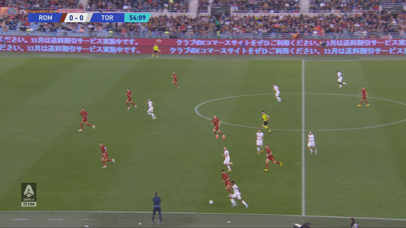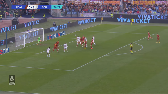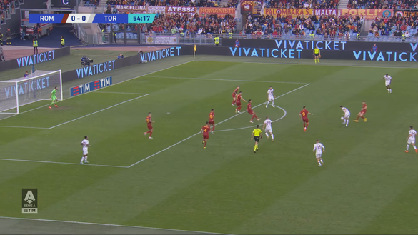Singo a questo punto non ci pensa due volte e notando la presenza di molti suoi compagni nell'area di rigore avversaria, fa partire un delicato traversone (immagine 3). In questo scatto si può notare come gli attaccanti del Toro siano in inferiorità rispetto ai difendenti della Roma ma questi ultimi non stanno marcando correttamente e ci sono sia Lazaro che Linetty liberi. Anche Vlasic, che si trova appena fuori dall'area si sta inserendo senza nessuno che lo segua.