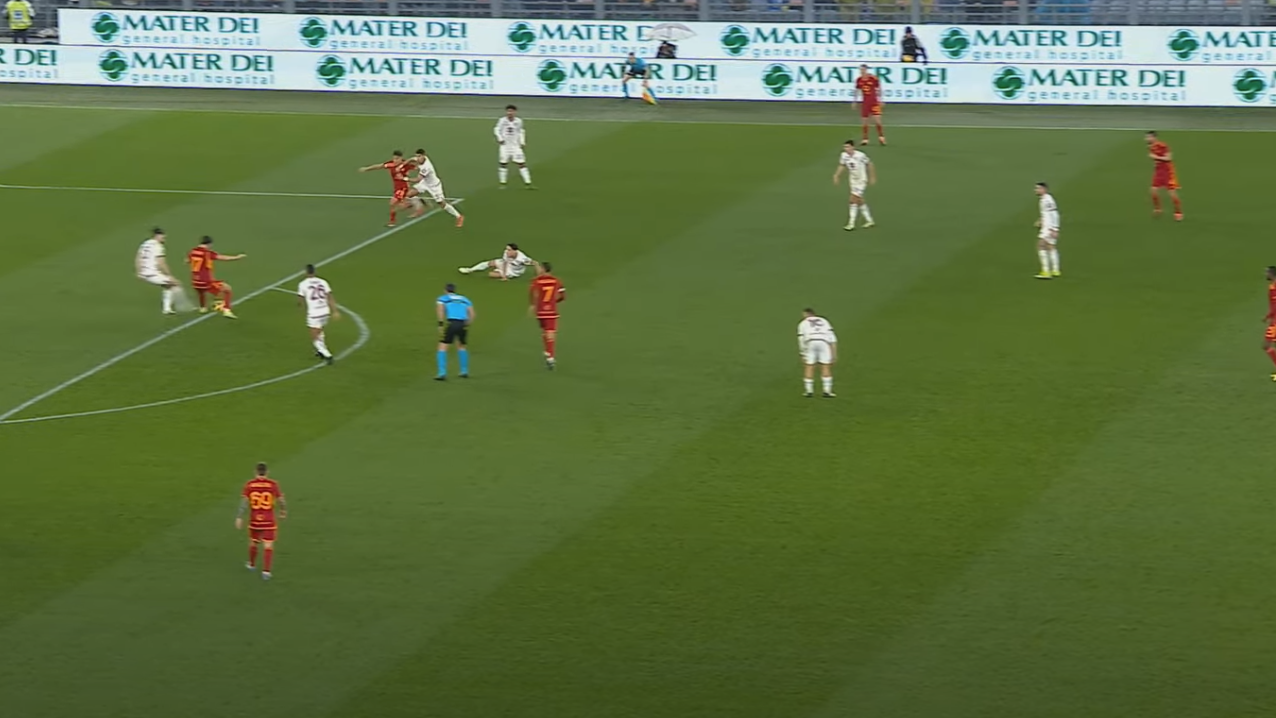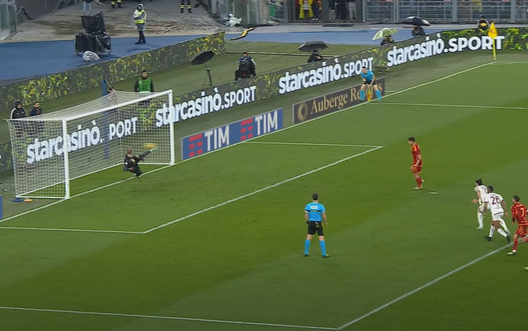 Il vantaggio della Roma arriva su rigore. Un penalty causato da un intervento ingenuo e sbagliato di Sazonov su Azmoun. Il georgiano granata, infatti, entra con troppa irruenza al posto di aspettare, visto che l'attaccante giallorosso non aveva alcuna possibilità di girarsi o di creare situazioni pericolose.
