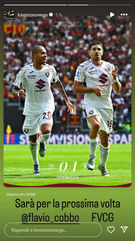Il Torino vince la sua prima partita stagionale in SerieA, espugnando l'Olimpico di Roma contro i giallorossi. I granata sono scesi molto bene in campo, soprattutto con una fase difensiva sempre solita, grazie al passaggio alla difesa a tre e un buon Israel. A decidere la gara una perla del "Cholito" Simeone nel secondo tempo, che segna con un gran gol dal limite dell'area il suo primo gol in granata. Di seguito le migliori reazioni su X dei tifosi granata al termine della sfida di SerieA tra Roma e Torino. Festeggia anche Lorenzo Sonego. Il tennista, grande tifoso granata, scherza con l'amico e collega Flavio Cobolli, di fede giallorossa. "Sarà per la prossima volta".