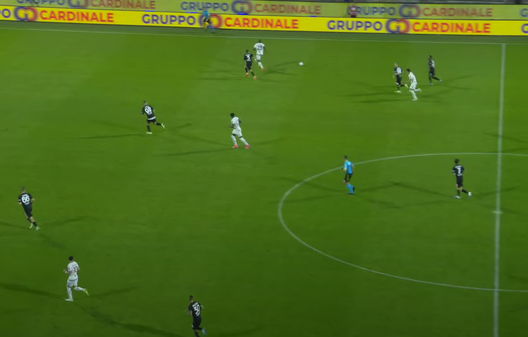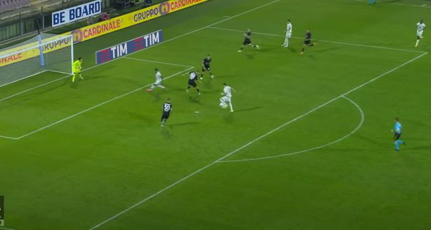 Poi Seck serve Bellanova che deve andare al cross. Da notare qui come si muovano all'unisono Zapata e Radonjic. Il colombiano corre sul primo palo per liberare lo spazio a centro area a Radonjic, che così può liberarsi al tiro.