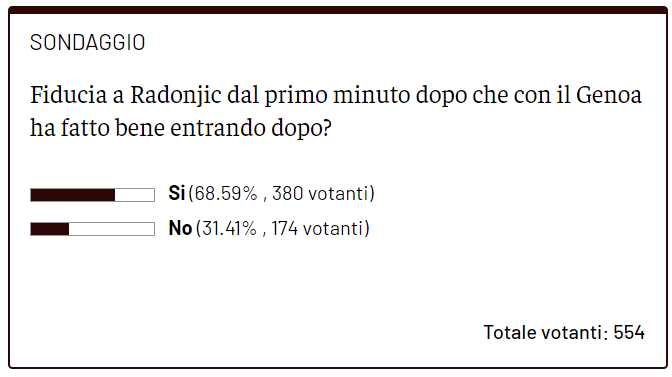 In occasione di Salernitana-Torino si rinnova il consueto ballottaggio sulla trequarti. Al centro di questo c'è Nemanja Radonjic, che con una perla ha deciso la sfida con il Genoa segnando il primo gol con la 10 granata sulle spalle e regalando la prima vittoria in campionato al Toro. Abbiamo chiesto ai lettori di Toro News proprio come impiegare il serbo, che contro il Genoa era partito dalla panchina subentrando al 64' a Vlasic per fare coppia con Seck, in campo al posto di Tameze. La maggioranza dei votanti non ha dubbi: Radonjic non deve partire dalla panchina. Il 69% infatti lo vuole subito in campo sulla trequarti per potersi affidare alle sue qualità. Il 31% invece concorda con la scelta di Juric dell'ultima uscita e vedrebbe meglio un altro duo titolare a Salerno per poi impiegare il serbo eventualmente a gara in corso.