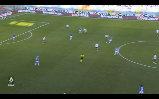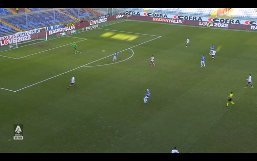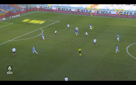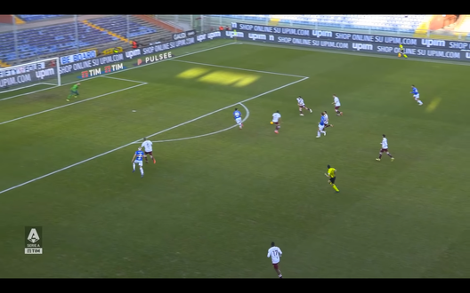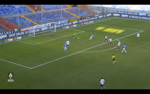 L'attaccante blucerchiato si trova molto spazio davanti a sé, come si vede nell'immagine 3. I reparti di difesa e centrocampo del Torino sono rimasti poco vicini dal momento che il possesso palla era granata e questo punto recuperare la posizione diventa complicato.
