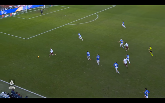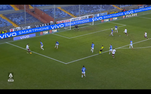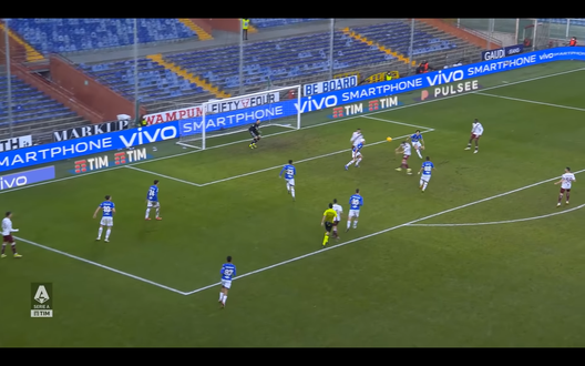 Lukic guadagna il fondo e sposta la palla sul destro approfittando del posizionamento sbagliato da parte della difesa blucerchiata, come si può vedere nell'immagine 2 dove ci sono due giocatori del Toro liberi dalle marcature.