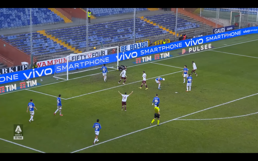 Il cross del numero 10 è preciso e trova Praet solo in area che ha tutto il tempo per indirizzare bene il pallone dove preferisce e riesce a battere il portiere blucerchiato Falcone con un colpo di testa che si insacca a fil di palo (Immagine 3).