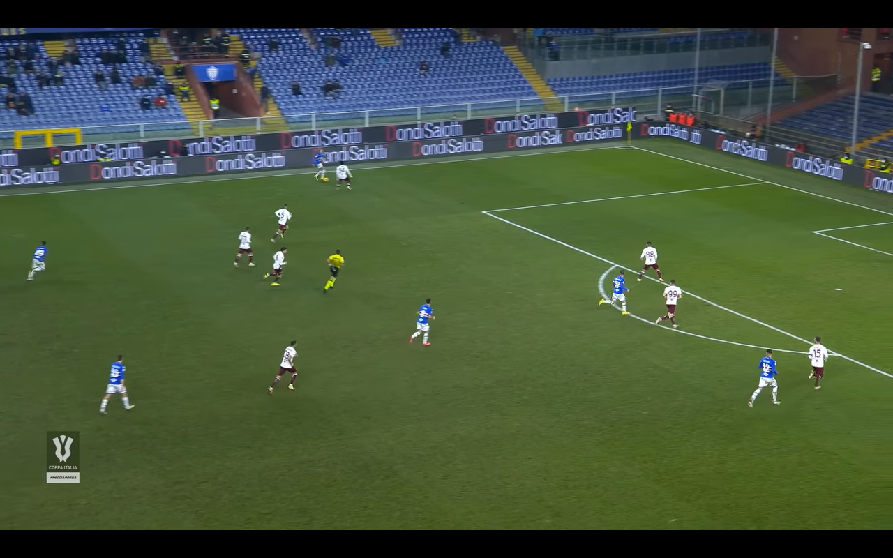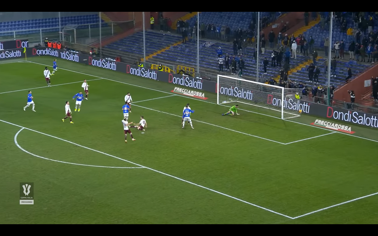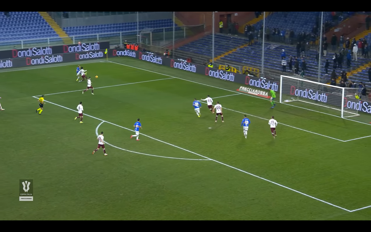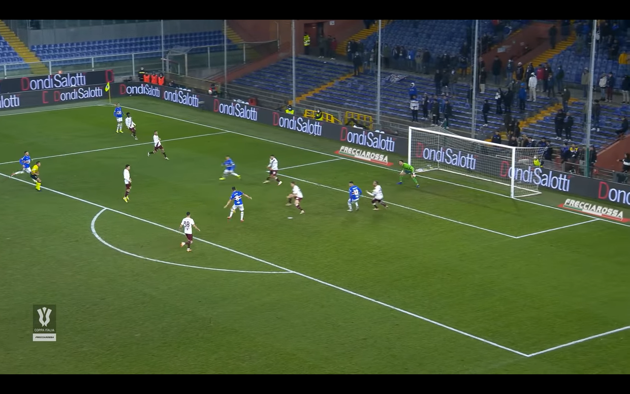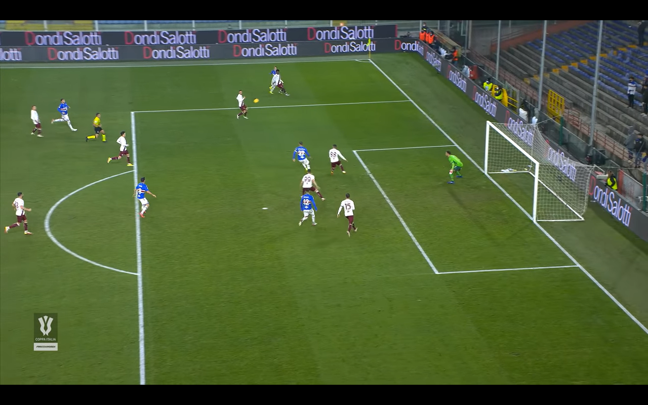 Il Toro rimane sul pareggio per soli 5 minuti perché poi la Sampdoria torna avanti. L'azione della rete comincia con il lancio verso il giovane Ciervo che si trova in una posizione laterale. A contrastare il numero 11 doriano ci pensa Ola Aina (Immagine 1).